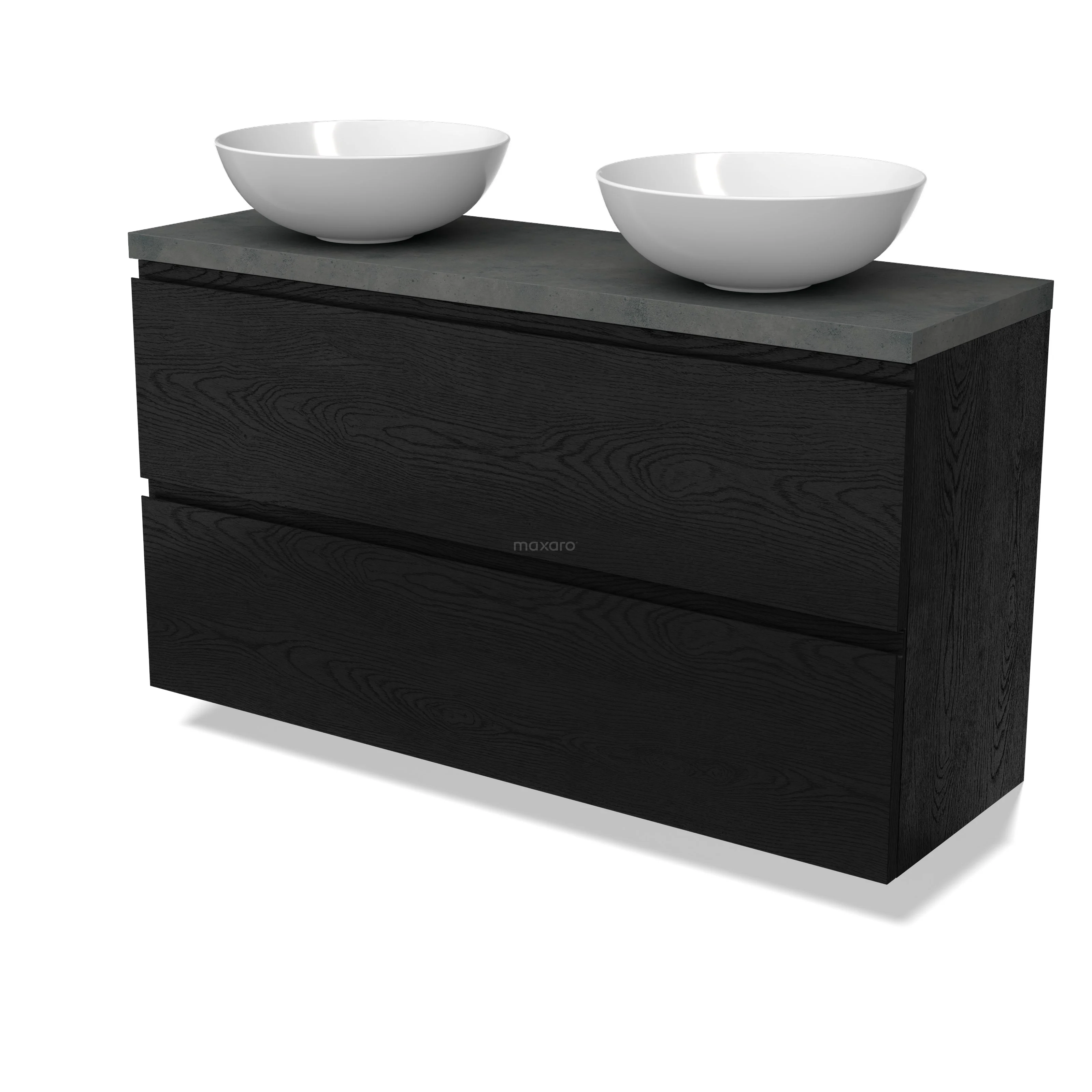 Modulo Plato Slim Badmöbel mit Aufsatzwaschbecken | 120 cm Schwarze Eiche Grifflos front Dunkelgrauer Beton blatt 2 übereinanderliegende Schubladen