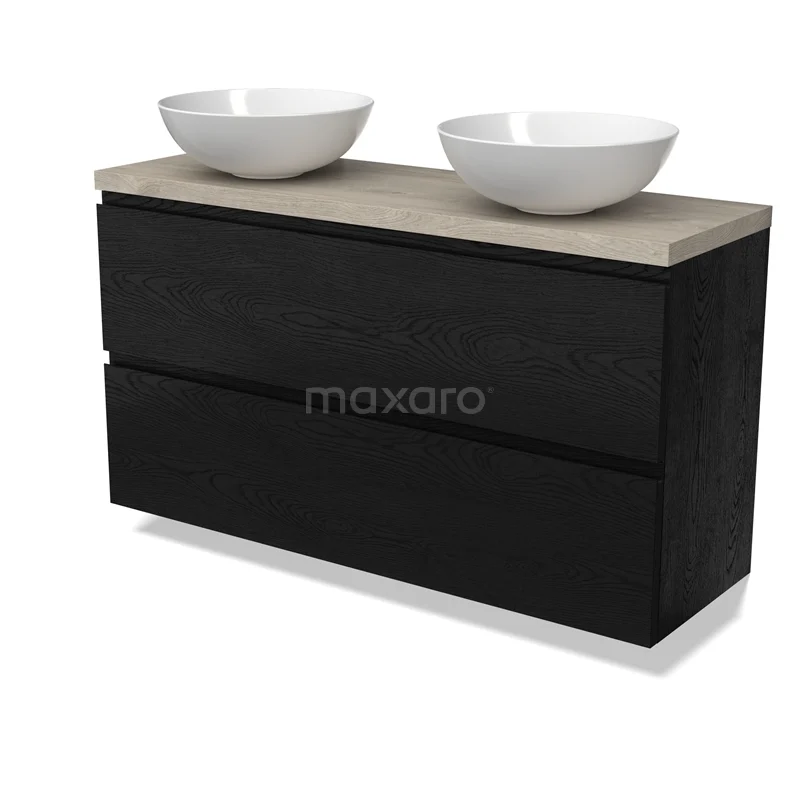 Modulo Plato Slim Badmöbel mit Aufsatzwaschbecken | 120 cm Schwarze Eiche Grifflos front Hellgraue Eiche blatt 2 übereinanderliegende Schubladen