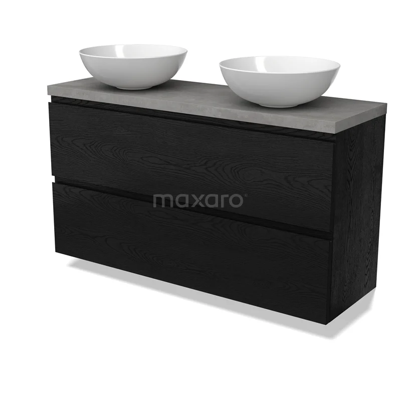 Modulo Plato Slim Badmöbel mit Aufsatzwaschbecken | 120 cm Schwarze Eiche Grifflos front Hellgrauer Beton blatt 2 übereinanderliegende Schubladen