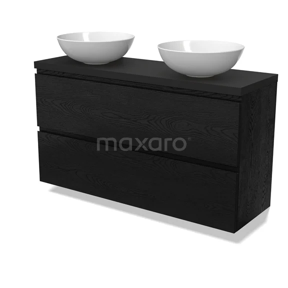 Modulo Plato Slim Badmöbel mit Aufsatzwaschbecken | 120 cm Schwarze Eiche Grifflos front Matt Schwarz blatt 2 übereinanderliegende Schubladen