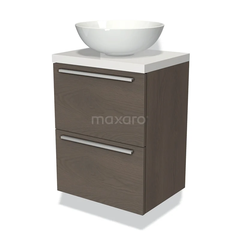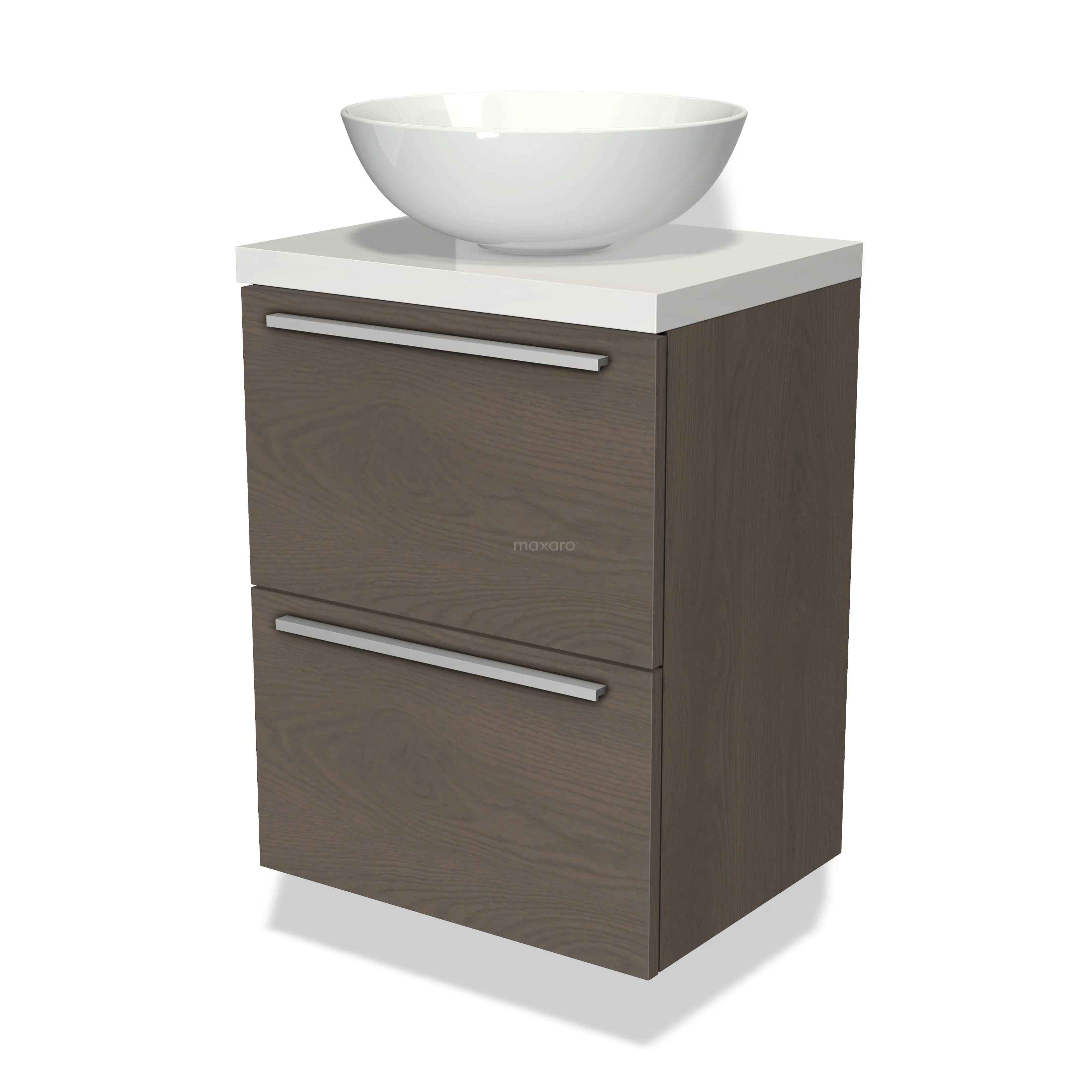 Modulo Plato Slim Badmöbel mit Aufsatzwaschbecken | 50 cm Dunkelbraune Eiche Flach front Hochglanz Weiß blatt 2 übereinanderliegende Schubladen
