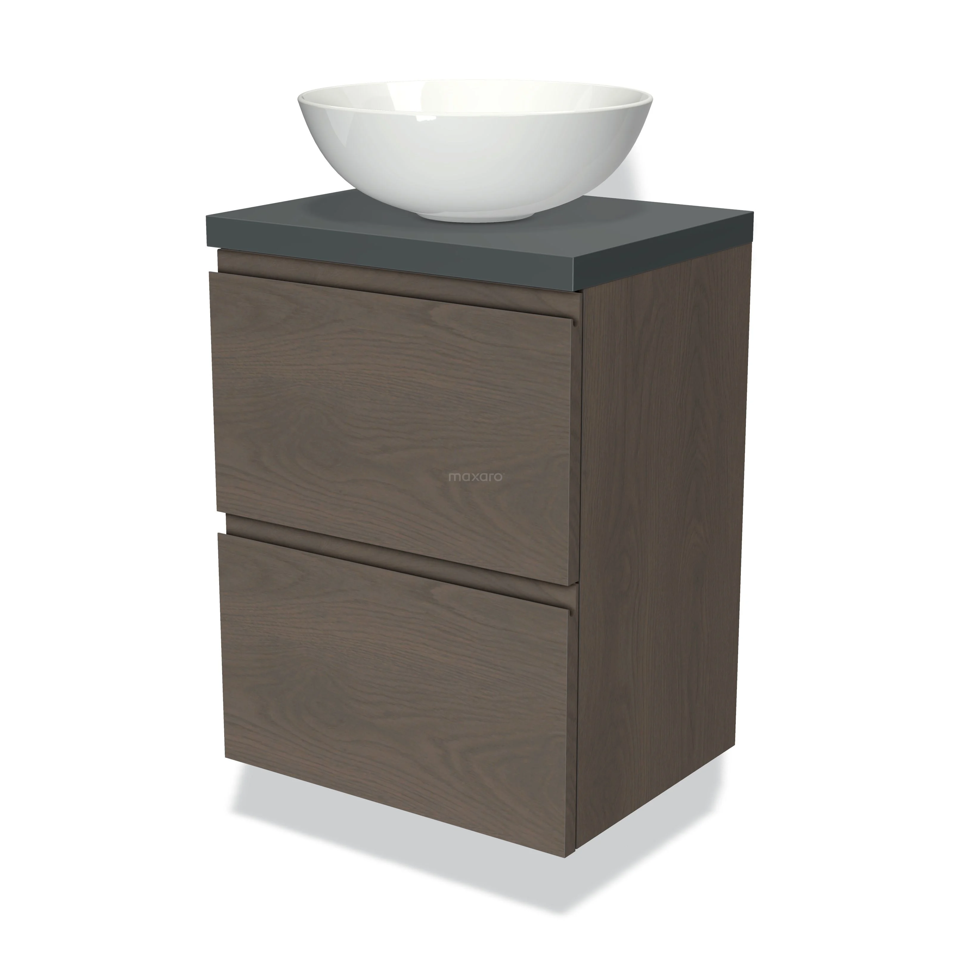 Modulo Plato Slim Badmöbel mit Aufsatzwaschbecken | 50 cm Dunkelbraune Eiche Grifflos front Dunkelgrau blatt 2 übereinanderliegende Schubladen