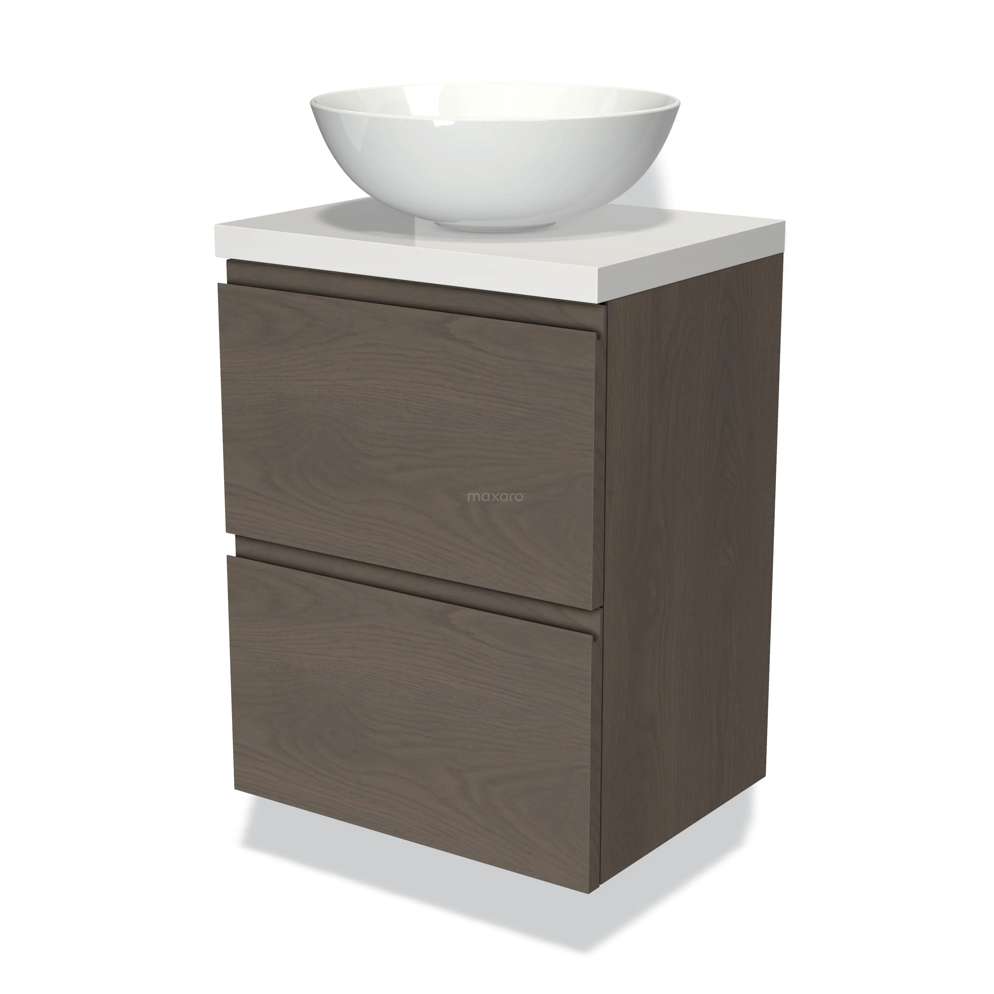 Modulo Plato Slim Badmöbel mit Aufsatzwaschbecken | 50 cm Dunkelbraune Eiche Grifflos front Hochglanz Weiß blatt 2 übereinanderliegende Schubladen