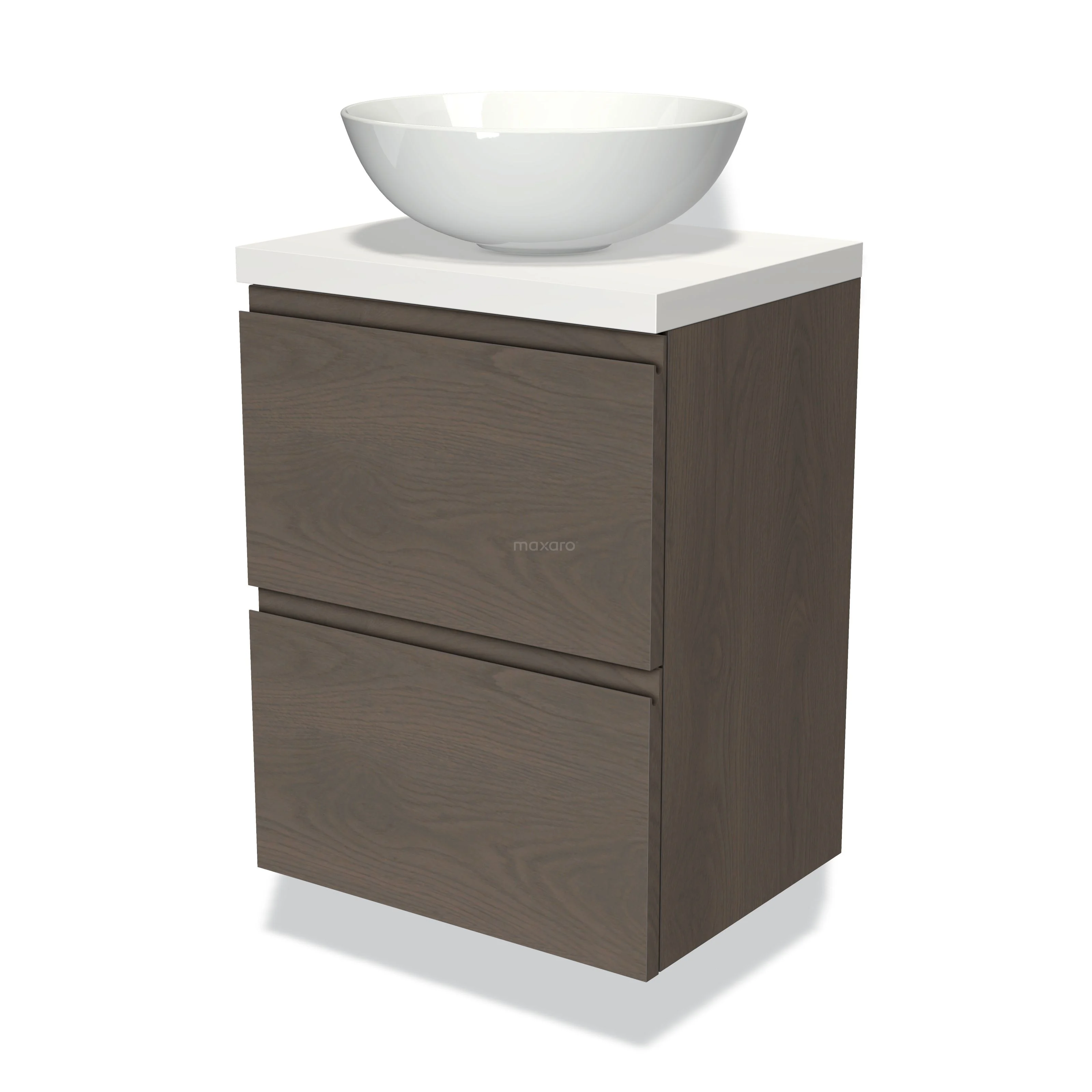 Modulo Plato Slim Badmöbel mit Aufsatzwaschbecken | 50 cm Dunkelbraune Eiche Grifflos front Matt Weiß blatt 2 übereinanderliegende Schubladen