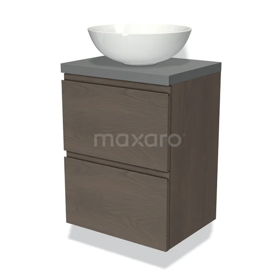 Modulo Plato Slim Badmöbel mit Aufsatzwaschbecken | 50 cm Dunkelbraune Eiche Grifflos front Mittelgrau blatt 2 übereinanderliegende Schubladen