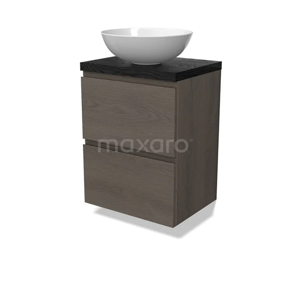 Modulo Plato Slim Badmöbel mit Aufsatzwaschbecken | 50 cm Dunkelbraune Eiche Grifflos front Schwarze Eiche blatt 2 übereinanderliegende Schubladen