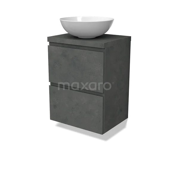 Modulo Plato Slim Badmöbel mit Aufsatzwaschbecken | 50 cm Dunkelgrauer Beton Grifflos front Dunkelgrauer Beton blatt 2 übereinanderliegende Schubladen