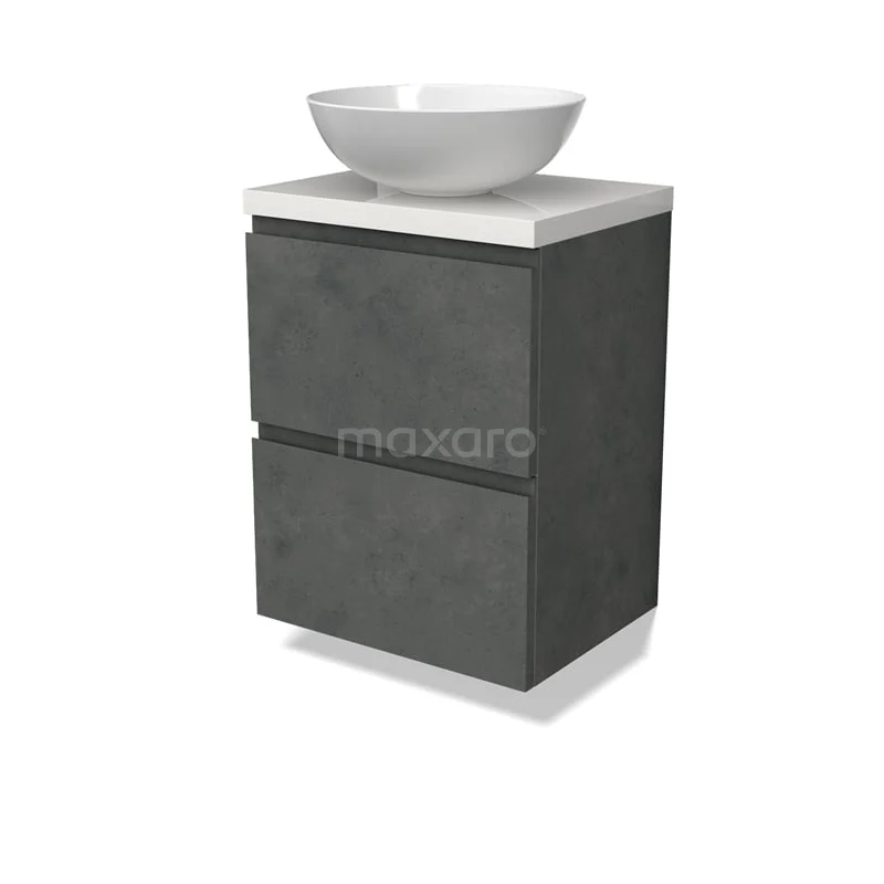 Modulo Plato Slim Badmöbel mit Aufsatzwaschbecken | 50 cm Dunkelgrauer Beton Grifflos front Hochglanz Weiß blatt 2 übereinanderliegende Schubladen