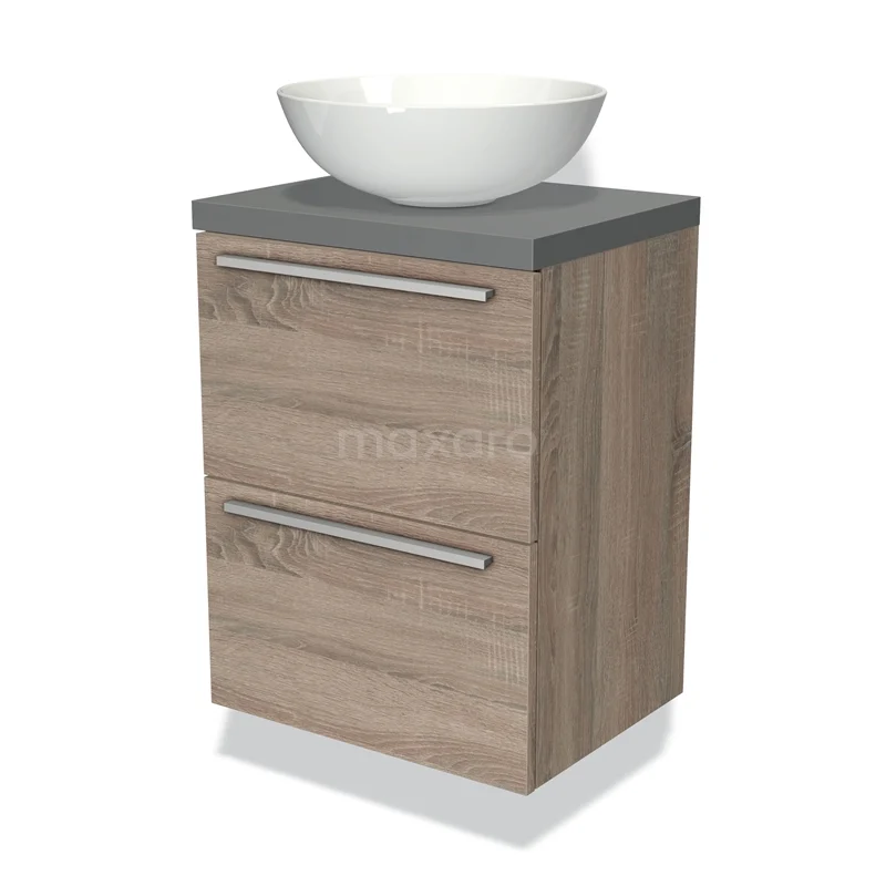 Modulo Plato Slim Badmöbel mit Aufsatzwaschbecken | 50 cm Eiche Flach front Mittelgrau blatt 2 übereinanderliegende Schubladen