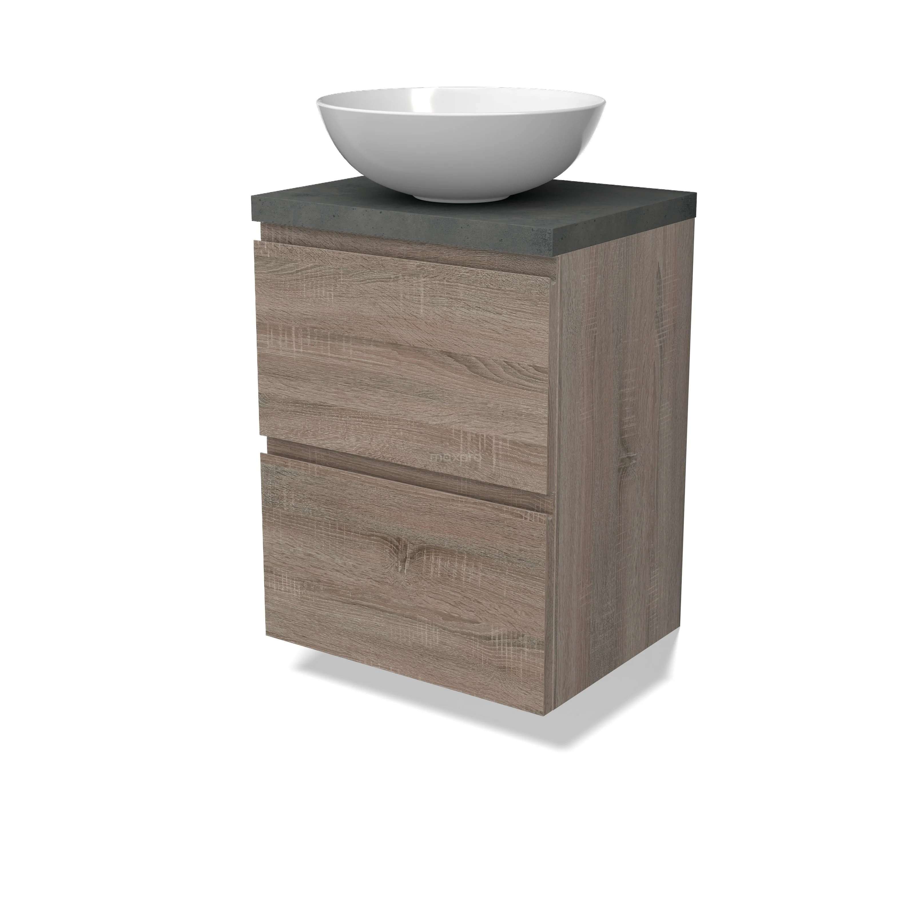 Modulo Plato Slim Badmöbel mit Aufsatzwaschbecken | 50 cm Eiche Grifflos front Dunkelgrauer Beton blatt 2 übereinanderliegende Schubladen