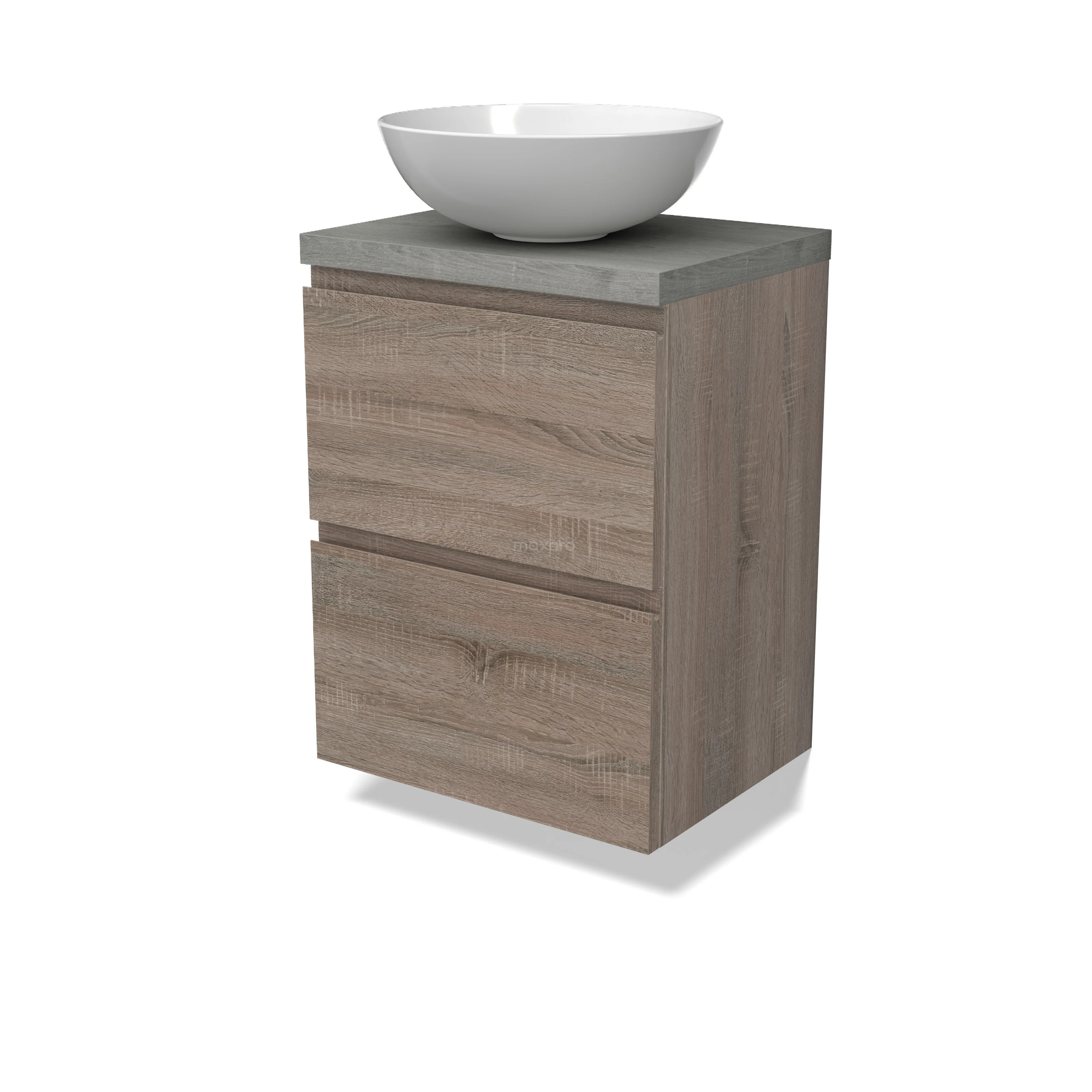 Modulo Plato Slim Badmöbel mit Aufsatzwaschbecken | 50 cm Eiche Grifflos front Graue Eiche blatt 2 übereinanderliegende Schubladen