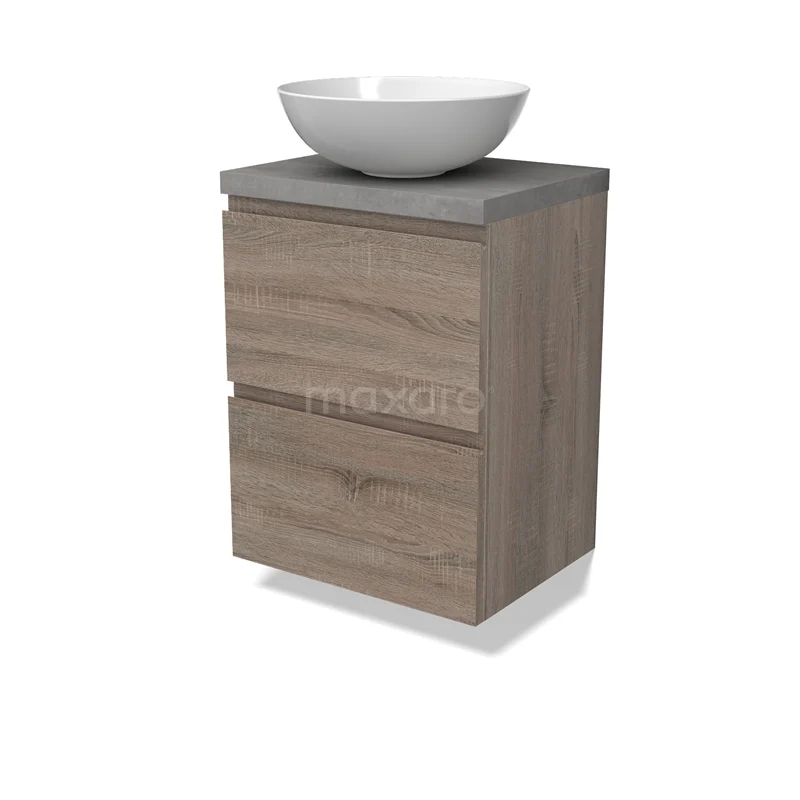 Modulo Plato Slim Badmöbel mit Aufsatzwaschbecken | 50 cm Eiche Grifflos front Hellgrauer Beton blatt 2 übereinanderliegende Schubladen