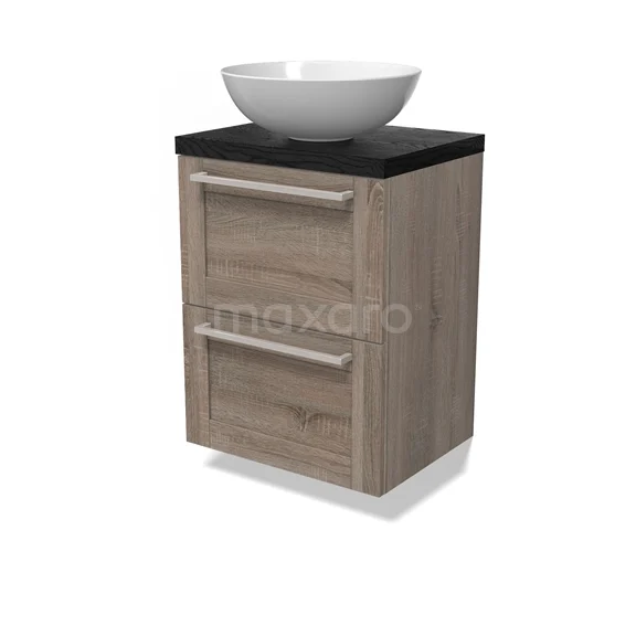 Modulo Plato Slim Badmöbel mit Aufsatzwaschbecken | 50 cm Eiche Rahmen front Schwarze Eiche blatt 2 übereinanderliegende Schubladen