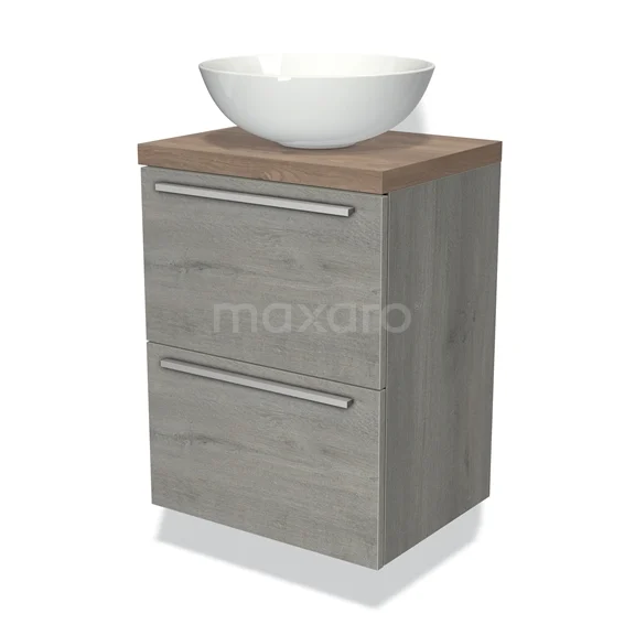 Modulo Plato Slim Badmöbel mit Aufsatzwaschbecken | 50 cm Graue Eiche Flach front Mittelbraune Eiche blatt 2 übereinanderliegende Schubladen