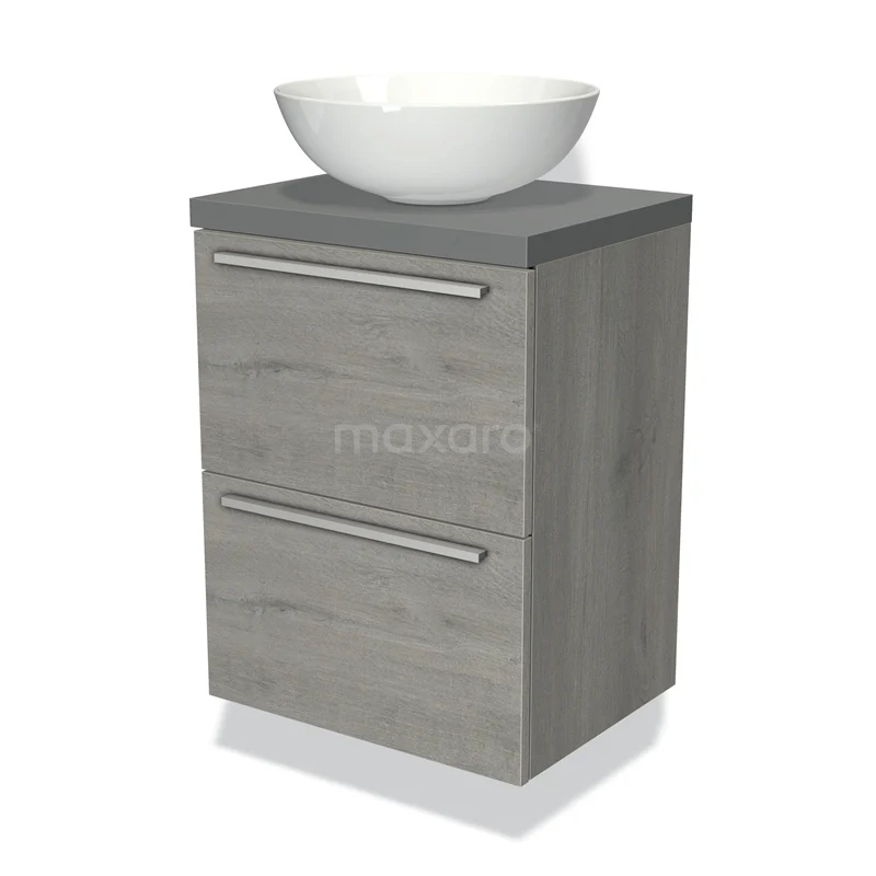 Modulo Plato Slim Badmöbel mit Aufsatzwaschbecken | 50 cm Graue Eiche Flach front Mittelgrau blatt 2 übereinanderliegende Schubladen