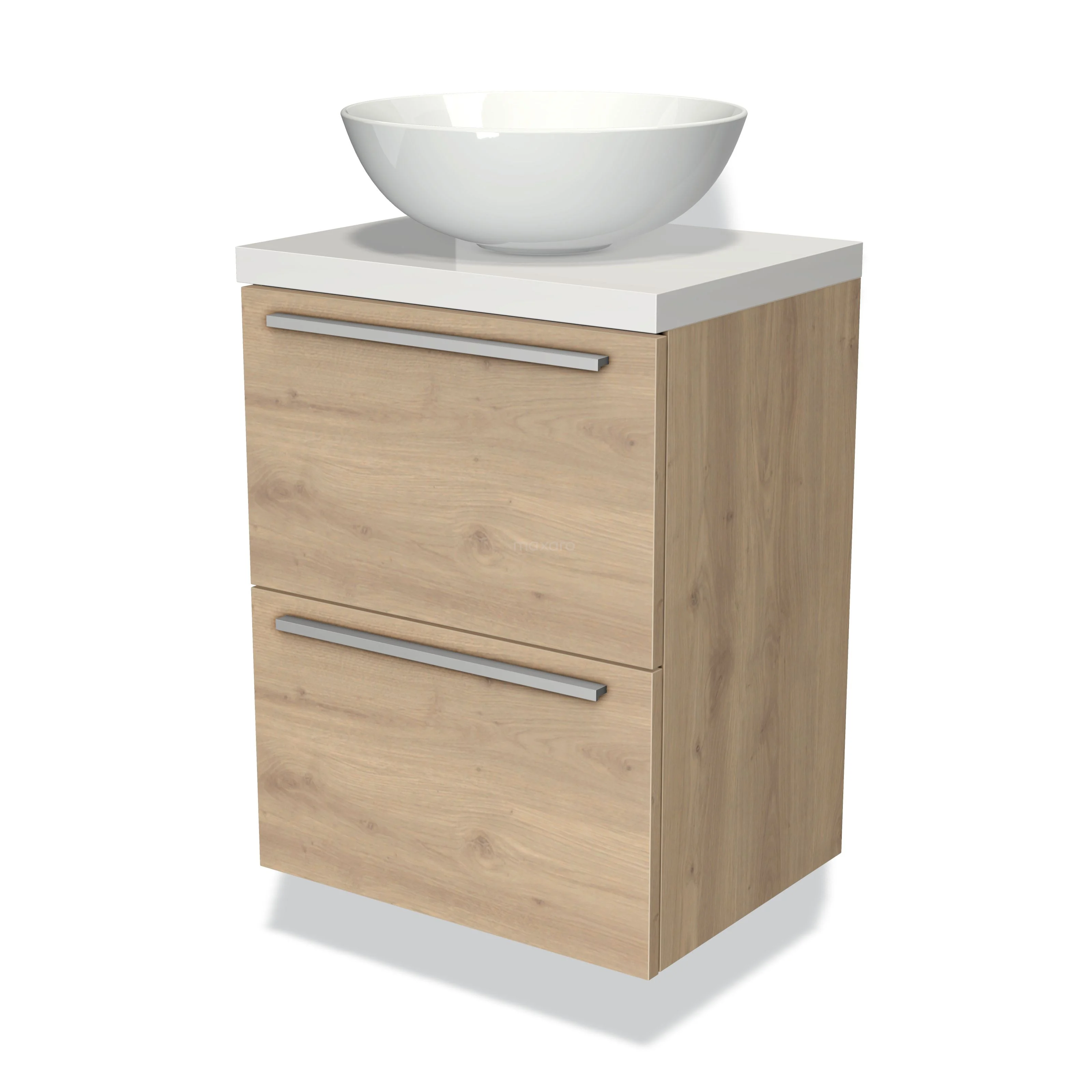 Modulo Plato Slim Badmöbel mit Aufsatzwaschbecken | 50 cm Hellbraune Eiche Flach front Hochglanz Weiß blatt 2 übereinanderliegende Schubladen