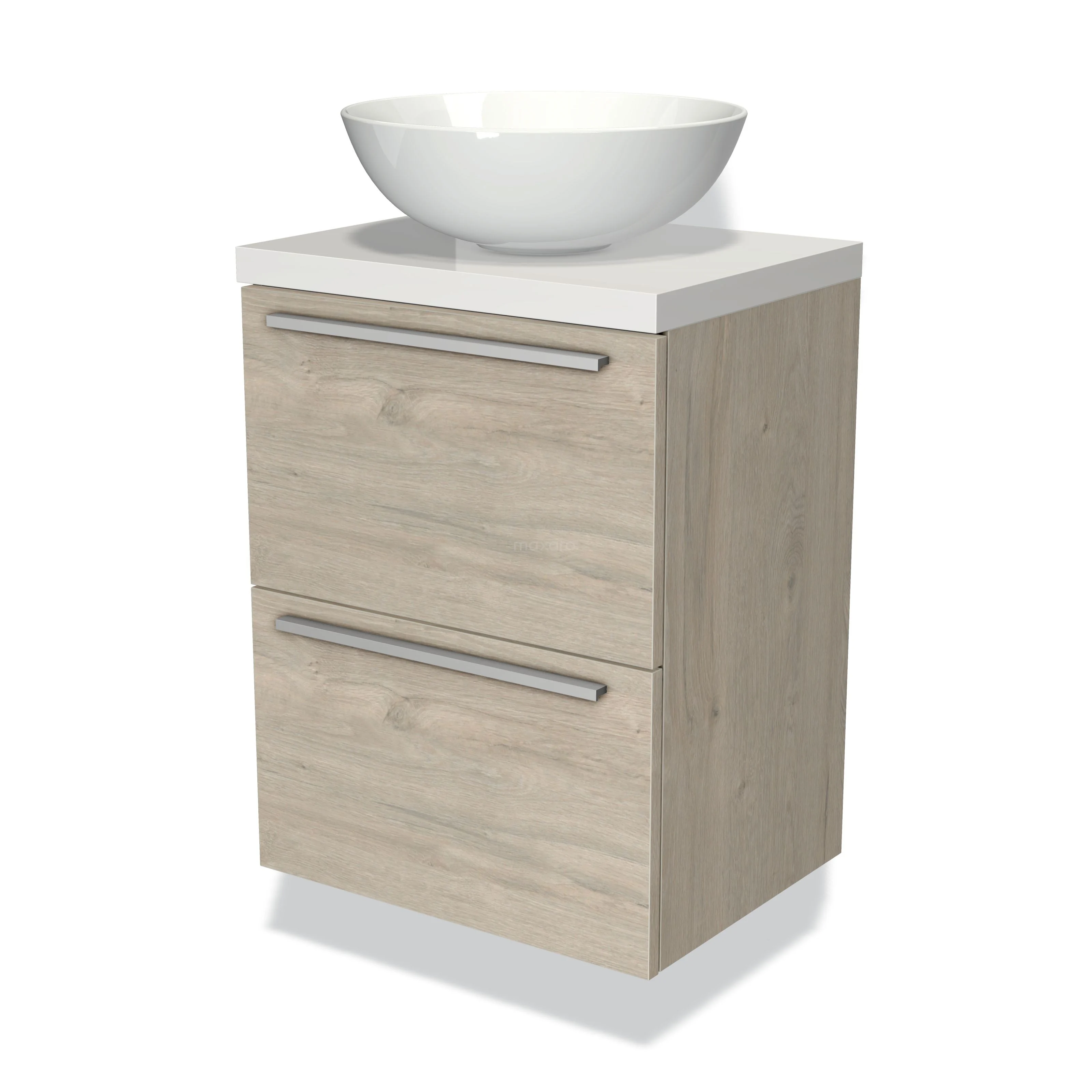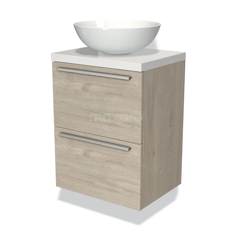 Modulo Plato Slim Badmöbel mit Aufsatzwaschbecken | 50 cm Hellgraue Eiche Flach front Hochglanz Weiß blatt 2 übereinanderliegende Schubladen