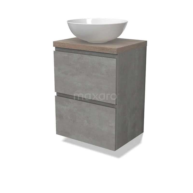 Modulo Plato Slim Badmöbel mit Aufsatzwaschbecken | 50 cm Hellgrauer Beton Grifflos front Eiche blatt 2 übereinanderliegende Schubladen
