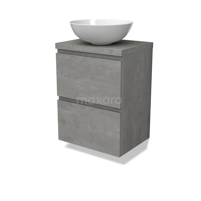 Modulo Plato Slim Badmöbel mit Aufsatzwaschbecken | 50 cm Hellgrauer Beton Grifflos front Graue Eiche blatt 2 übereinanderliegende Schubladen