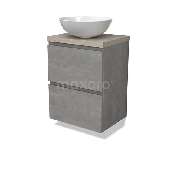 Modulo Plato Slim Badmöbel mit Aufsatzwaschbecken | 50 cm Hellgrauer Beton Grifflos front Hellgraue Eiche blatt 2 übereinanderliegende Schubladen
