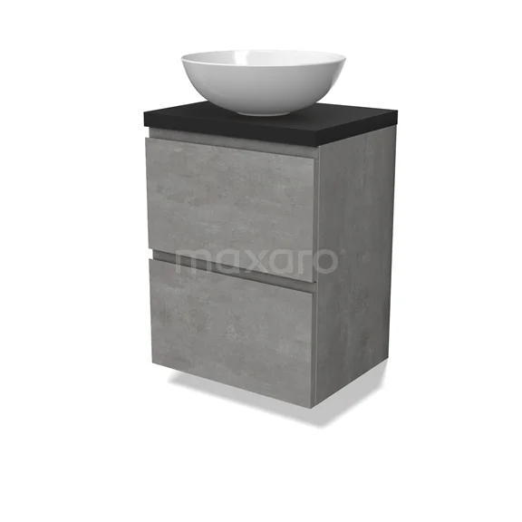 Modulo Plato Slim Badmöbel mit Aufsatzwaschbecken | 50 cm Hellgrauer Beton Grifflos front Matt Schwarz blatt 2 übereinanderliegende Schubladen