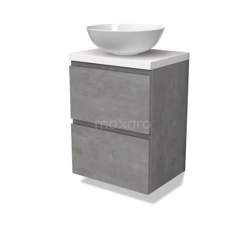 Modulo Plato Slim Badmöbel mit Aufsatzwaschbecken | 50 cm Hellgrauer Beton Grifflos front Matt Weiß blatt 2 übereinanderliegende Schubladen