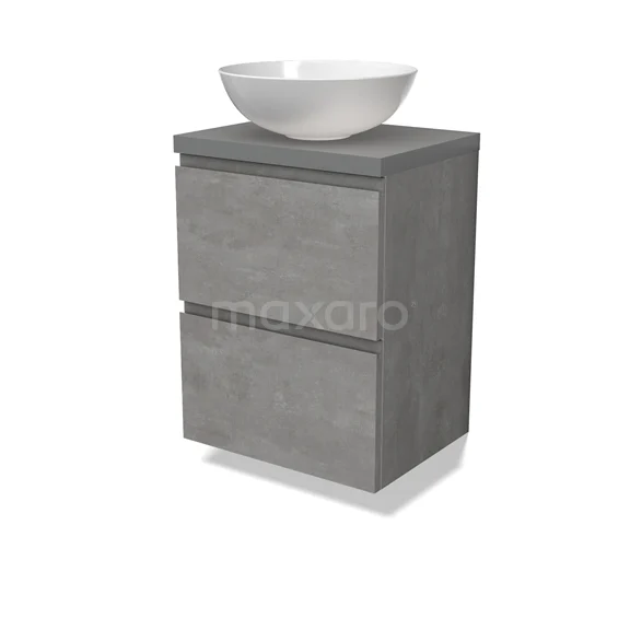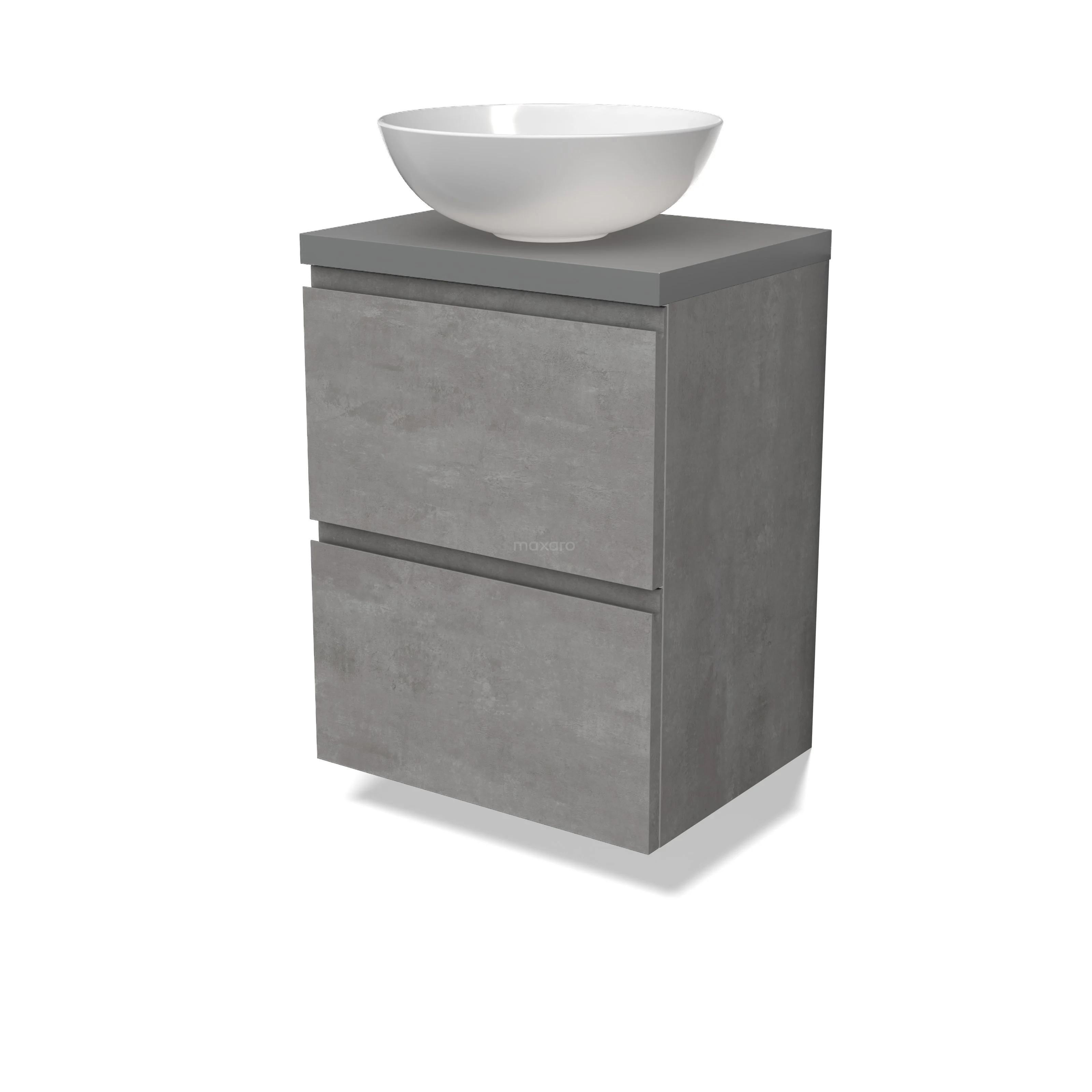 Modulo Plato Slim Badmöbel mit Aufsatzwaschbecken | 50 cm Hellgrauer Beton Grifflos front Mittelgrau blatt 2 übereinanderliegende Schubladen