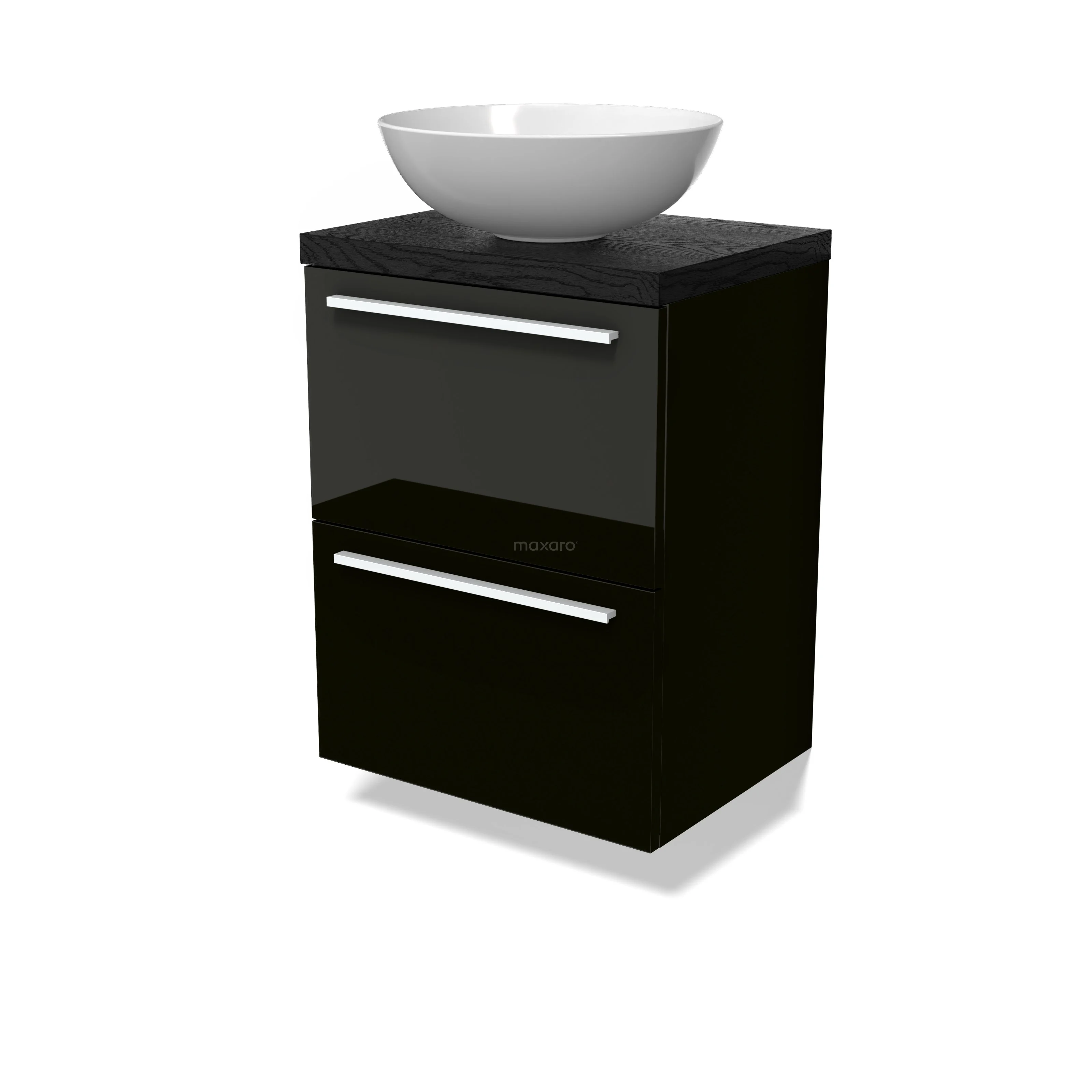 Modulo Plato Slim Badmöbel mit Aufsatzwaschbecken | 50 cm Hochglanz Schwarz Flach front Schwarze Eiche blatt 2 übereinanderliegende Schubladen