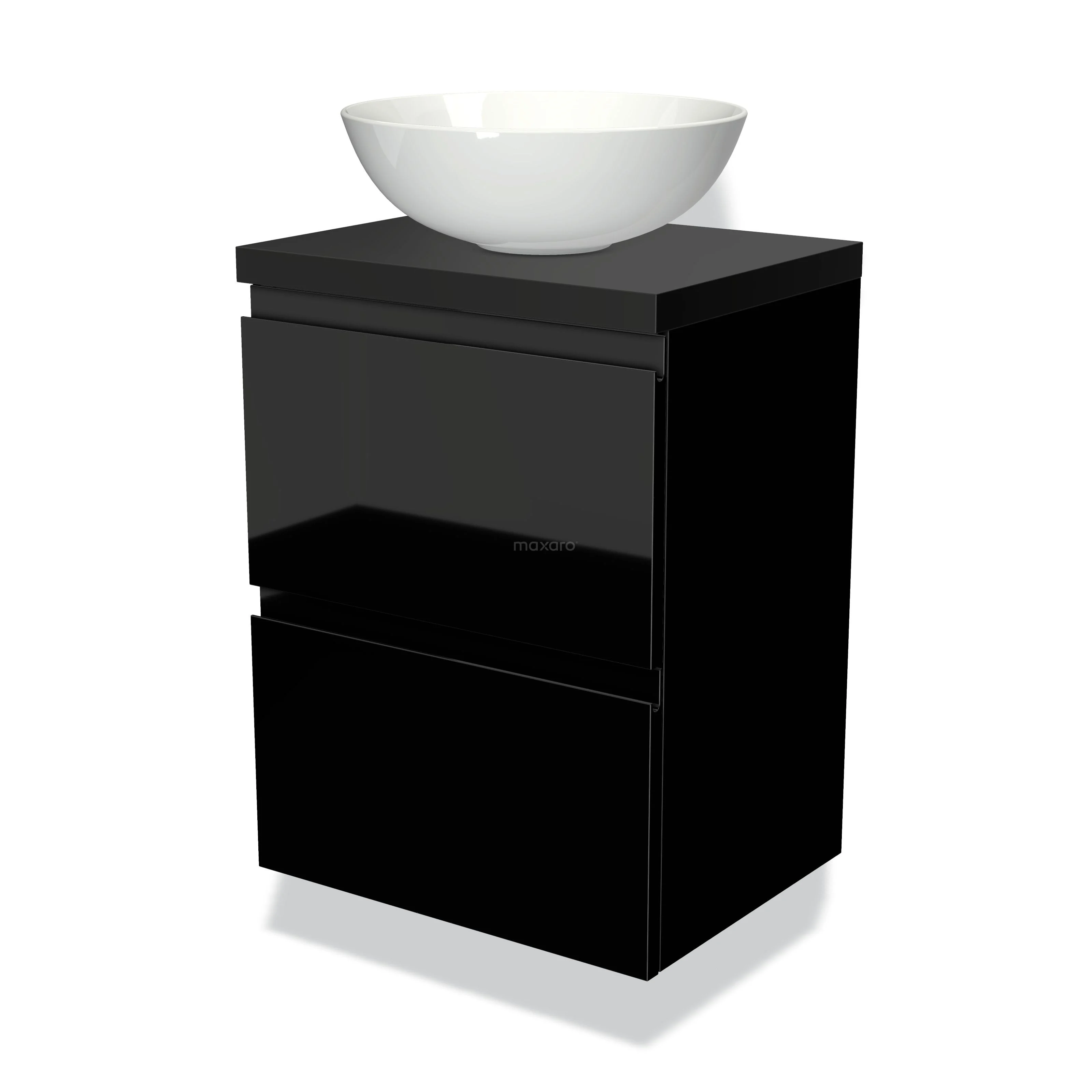 Modulo Plato Slim Badmöbel mit Aufsatzwaschbecken | 50 cm Hochglanz Schwarz Grifflos front Matt Schwarz blatt 2 übereinanderliegende Schubladen