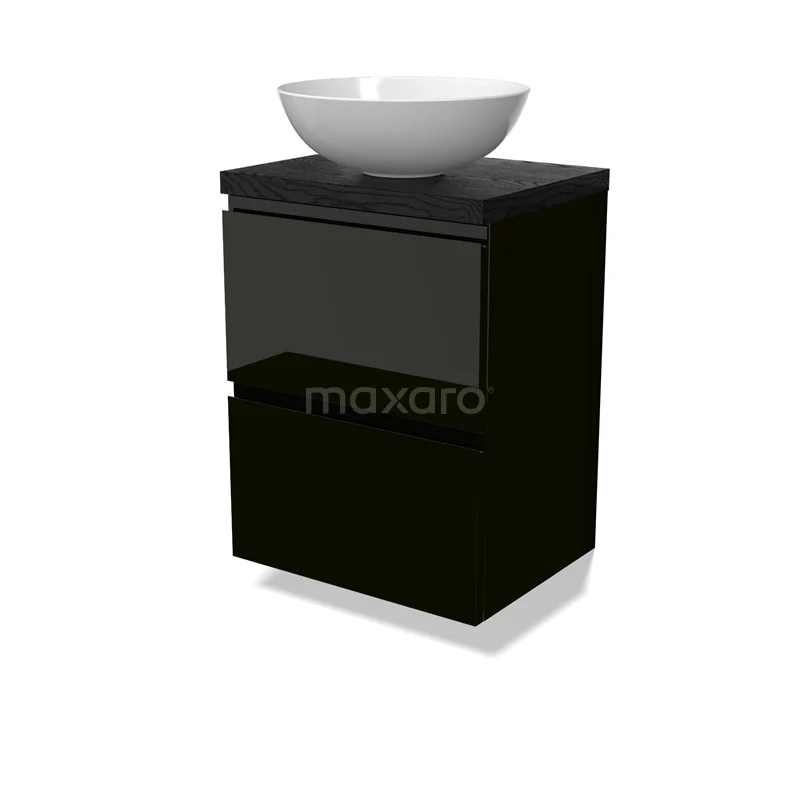 Modulo Plato Slim Badmöbel mit Aufsatzwaschbecken | 50 cm Hochglanz Schwarz Grifflos front Schwarze Eiche blatt 2 übereinanderliegende Schubladen