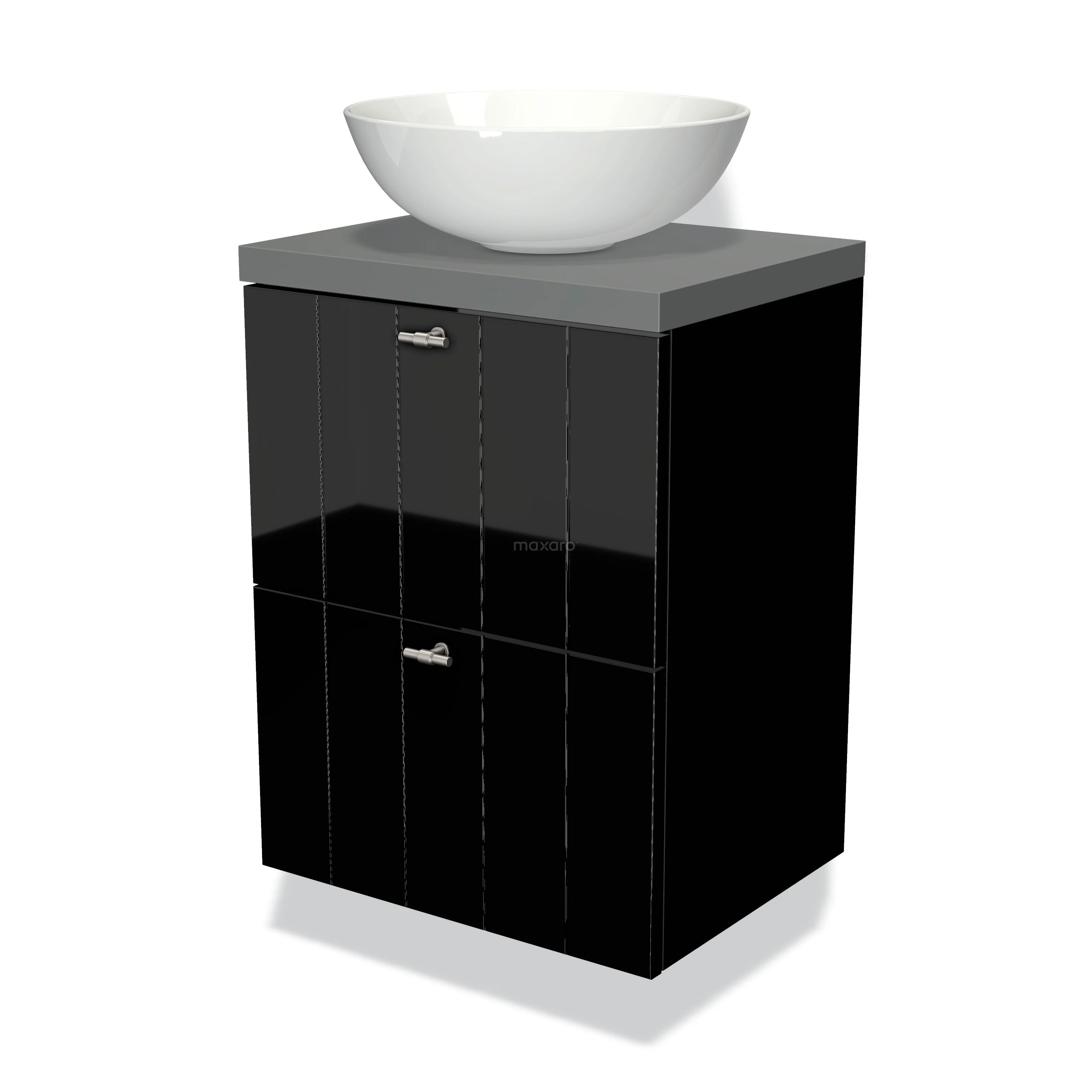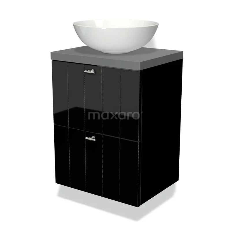 Modulo Plato Slim Badmöbel mit Aufsatzwaschbecken | 50 cm Hochglanz Schwarz Lamelle front Mittelgrau blatt 2 übereinanderliegende Schubladen
