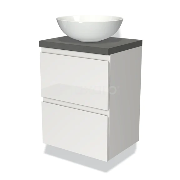 Modulo Plato Slim Badmöbel mit Aufsatzwaschbecken | 50 cm Hochglanz Weiß Grifflos front Dunkelgrauer Beton blatt 2 übereinanderliegende Schubladen