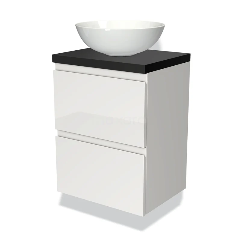 Modulo Plato Slim Badmöbel mit Aufsatzwaschbecken | 50 cm Hochglanz Weiß Grifflos front Matt Schwarz blatt 2 übereinanderliegende Schubladen