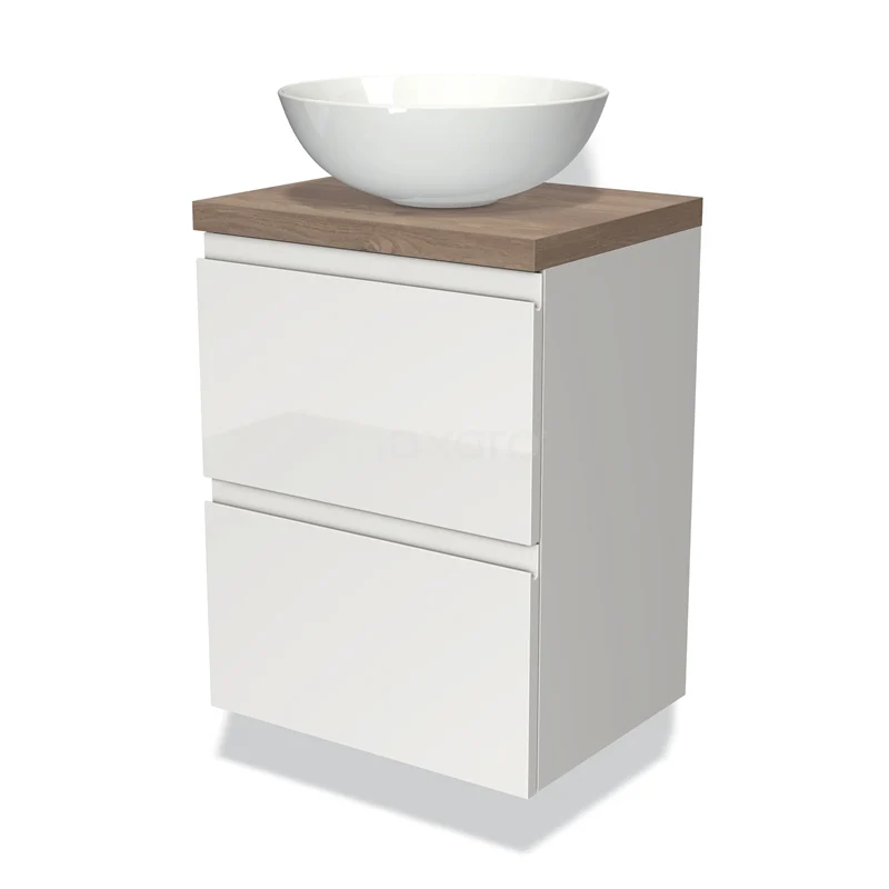 Modulo Plato Slim Badmöbel mit Aufsatzwaschbecken | 50 cm Hochglanz Weiß Grifflos front Mittelbraune Eiche blatt 2 übereinanderliegende Schubladen