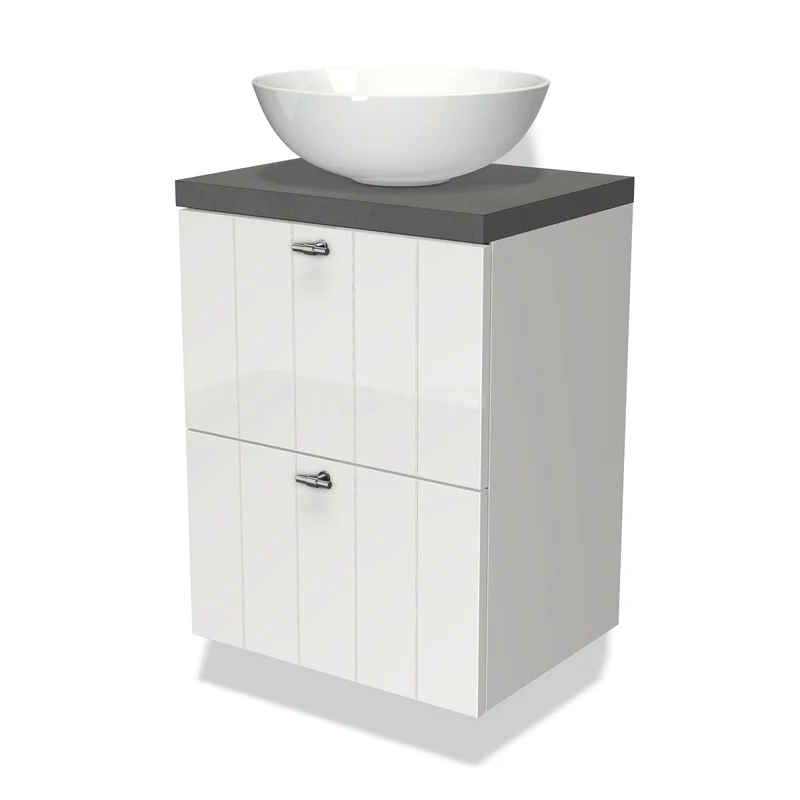 Modulo Plato Slim Badmöbel mit Aufsatzwaschbecken | 50 cm Hochglanz Weiß Lamelle front Dunkelgrauer Beton blatt 2 übereinanderliegende Schubladen