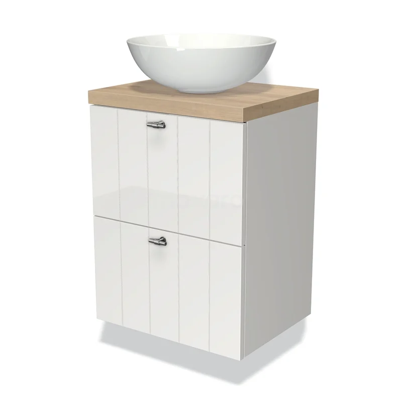 Modulo Plato Slim Badmöbel mit Aufsatzwaschbecken | 50 cm Hochglanz Weiß Lamelle front Hellbraune Eiche blatt 2 übereinanderliegende Schubladen