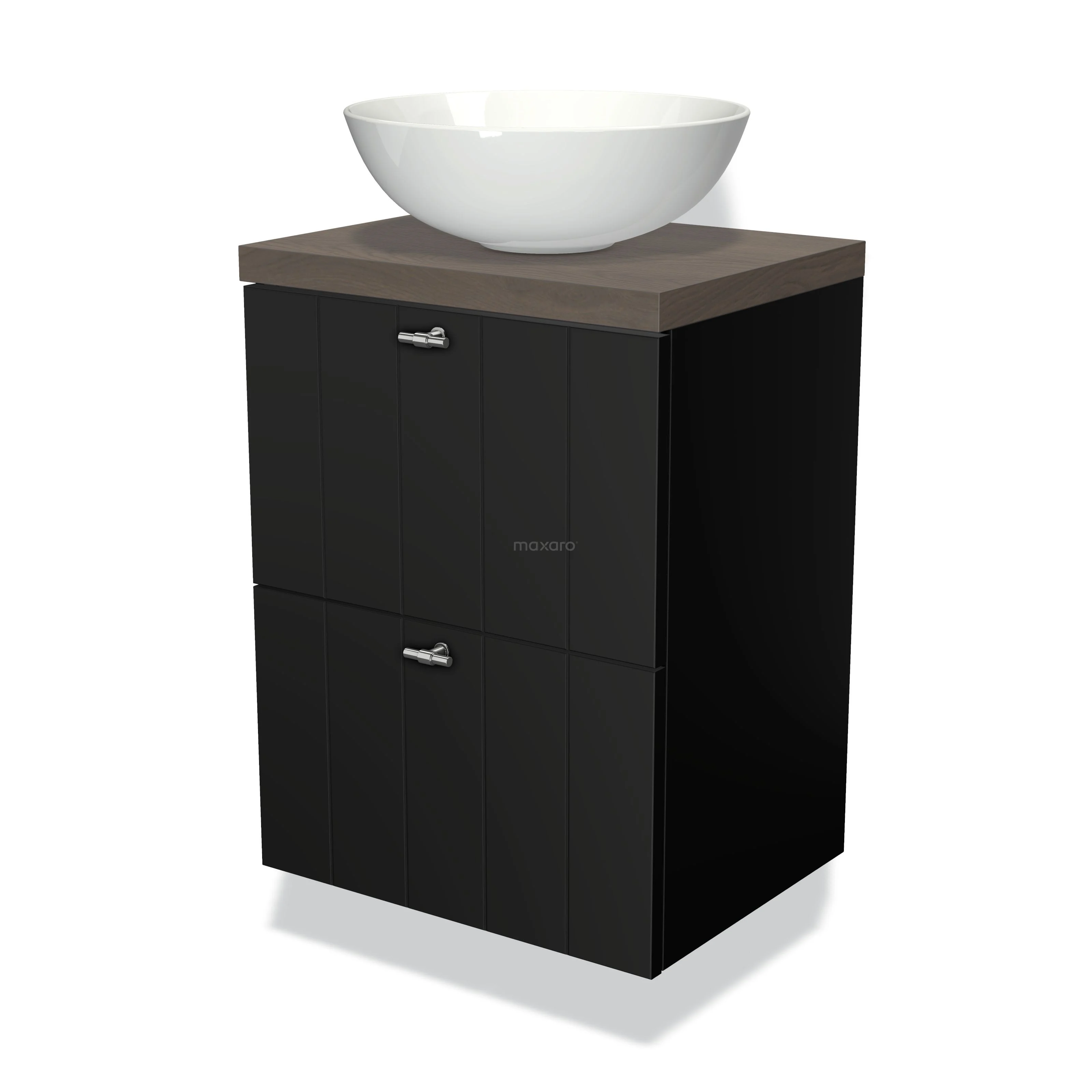 Modulo Plato Slim Badmöbel mit Aufsatzwaschbecken | 50 cm Matt Schwarz Lamelle front Dunkelbraune Eiche blatt 2 übereinanderliegende Schubladen