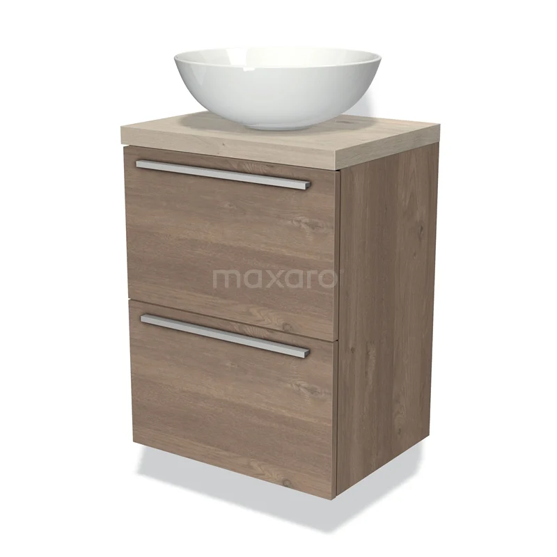 Modulo Plato Slim Badmöbel mit Aufsatzwaschbecken | 50 cm Mittelbraune Eiche Flach front Hellgraue Eiche blatt 2 übereinanderliegende Schubladen