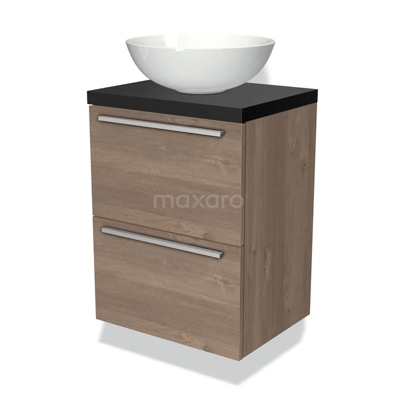 Modulo Plato Slim Badmöbel mit Aufsatzwaschbecken | 50 cm Mittelbraune Eiche Flach front Matt Schwarz blatt 2 übereinanderliegende Schubladen