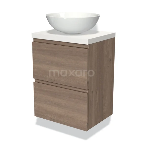 Modulo Plato Slim Badmöbel mit Aufsatzwaschbecken | 50 cm Mittelbraune Eiche Grifflos front Matt Weiß blatt 2 übereinanderliegende Schubladen