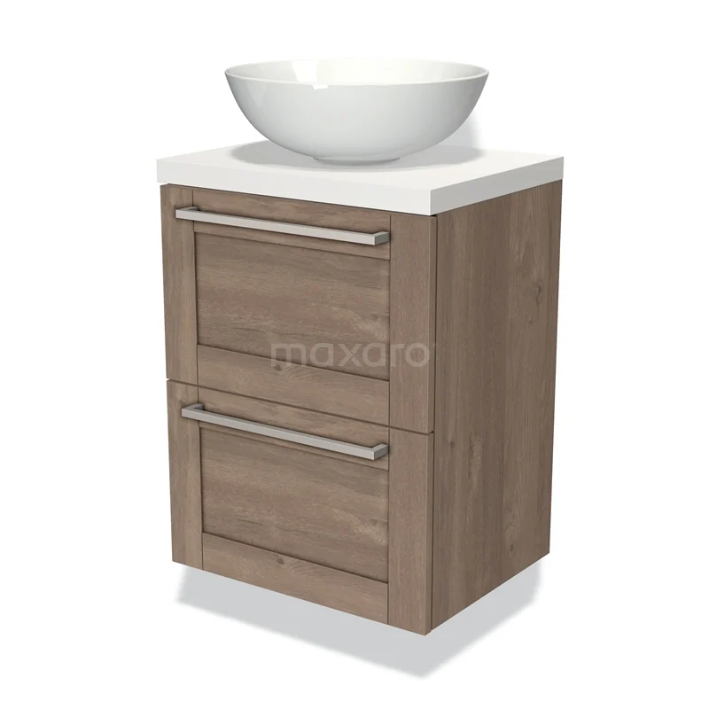 Modulo Plato Slim Badmöbel mit Aufsatzwaschbecken | 50 cm Mittelbraune Eiche Rahmen front Matt Weiß blatt 2 übereinanderliegende Schubladen