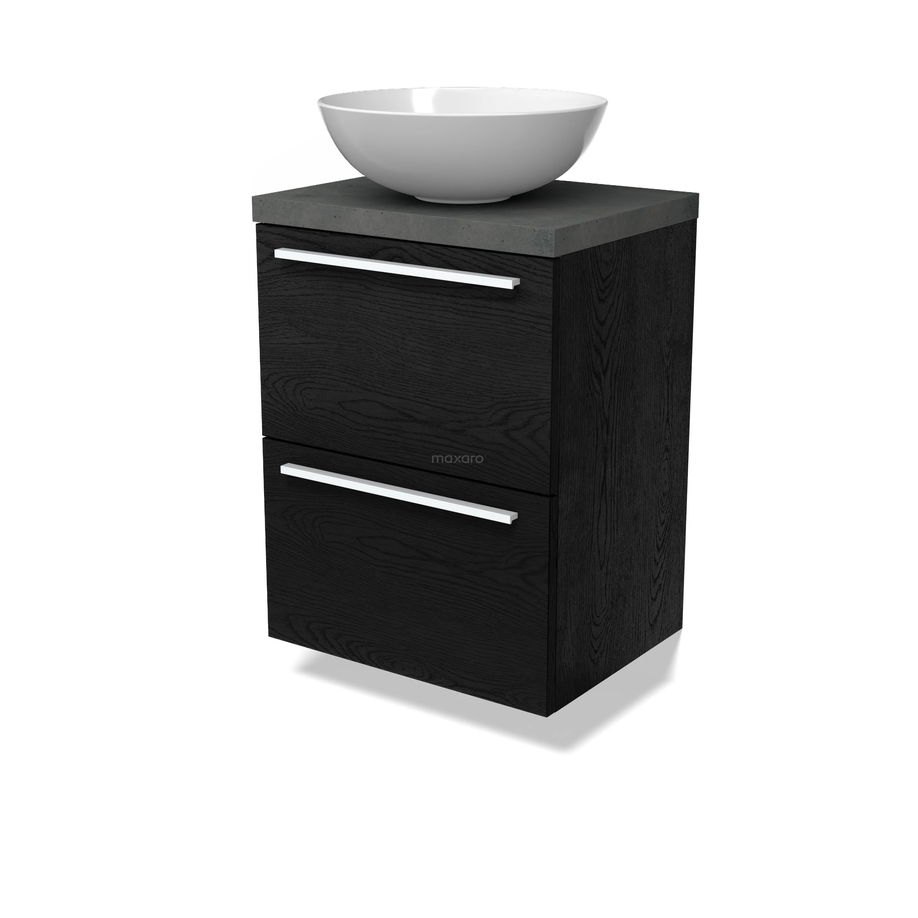 Modulo Plato Slim Badmöbel mit Aufsatzwaschbecken | 50 cm Schwarze Eiche Flach front Dunkelgrauer Beton blatt 2 übereinanderliegende Schubladen