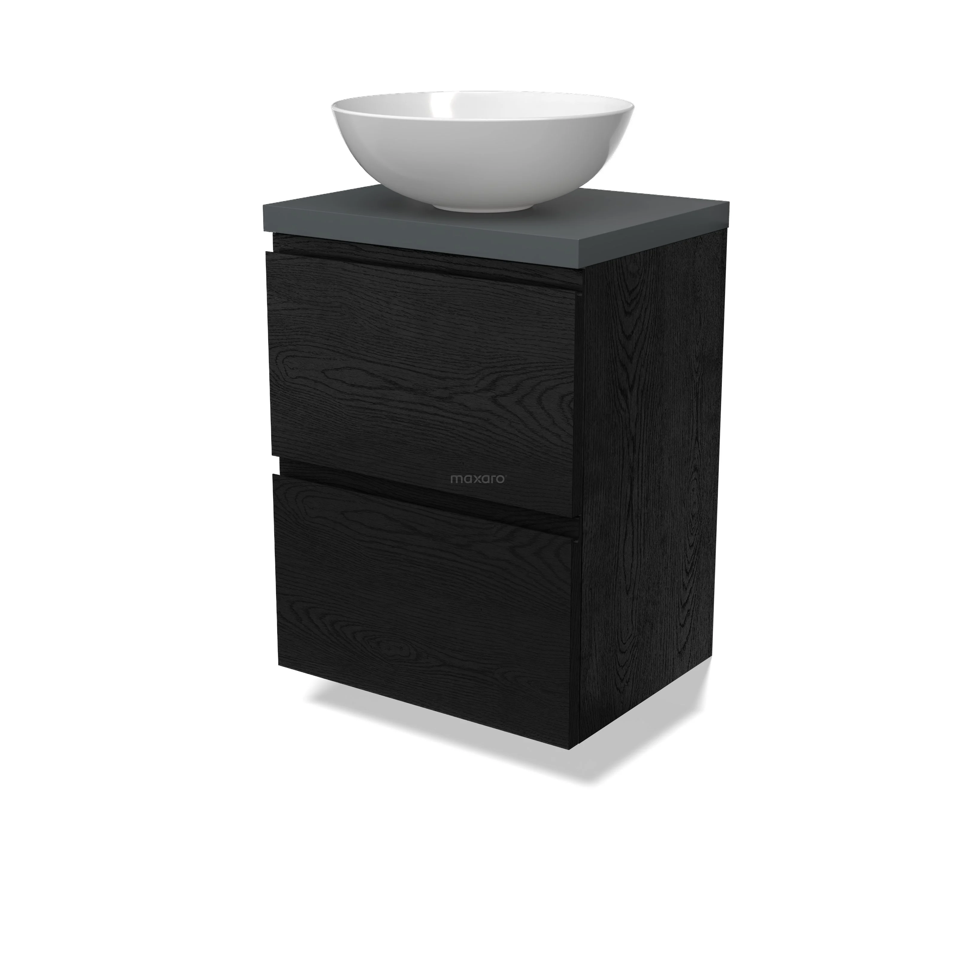 Modulo Plato Slim Badmöbel mit Aufsatzwaschbecken | 50 cm Schwarze Eiche Grifflos front Dunkelgrau blatt 2 übereinanderliegende Schubladen