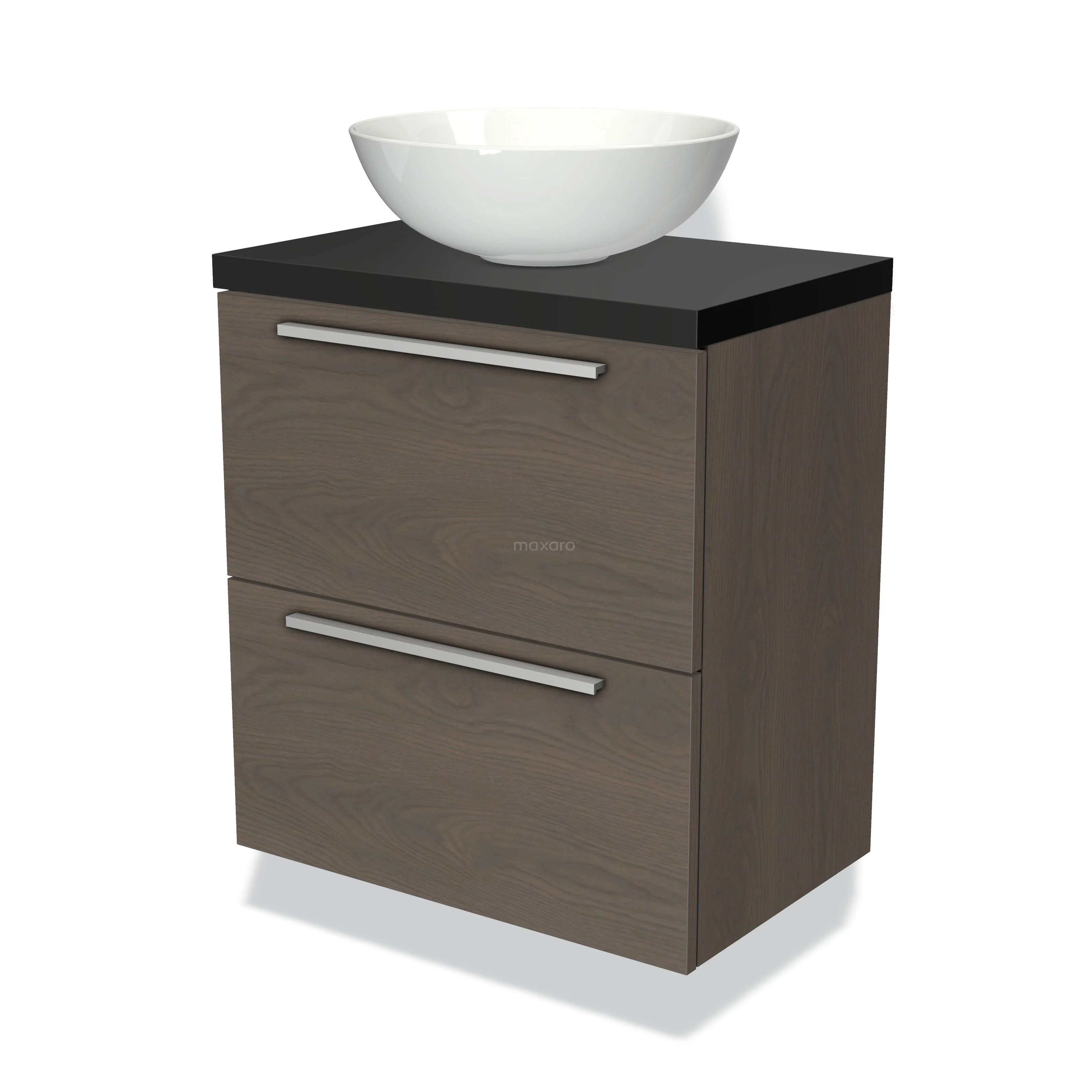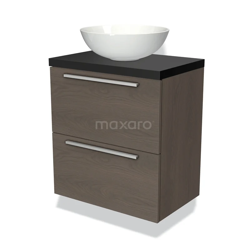 Modulo Plato Slim Badmöbel mit Aufsatzwaschbecken | 60 cm Dunkelbraune Eiche Flach front Matt Schwarz blatt 2 übereinanderliegende Schubladen