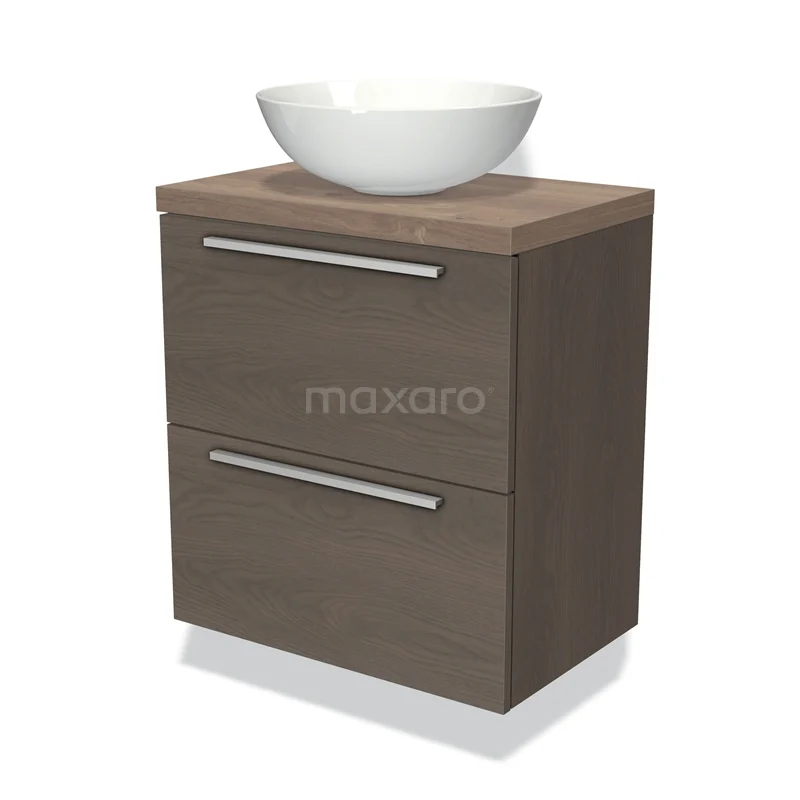 Modulo Plato Slim Badmöbel mit Aufsatzwaschbecken | 60 cm Dunkelbraune Eiche Flach front Mittelbraune Eiche blatt 2 übereinanderliegende Schubladen