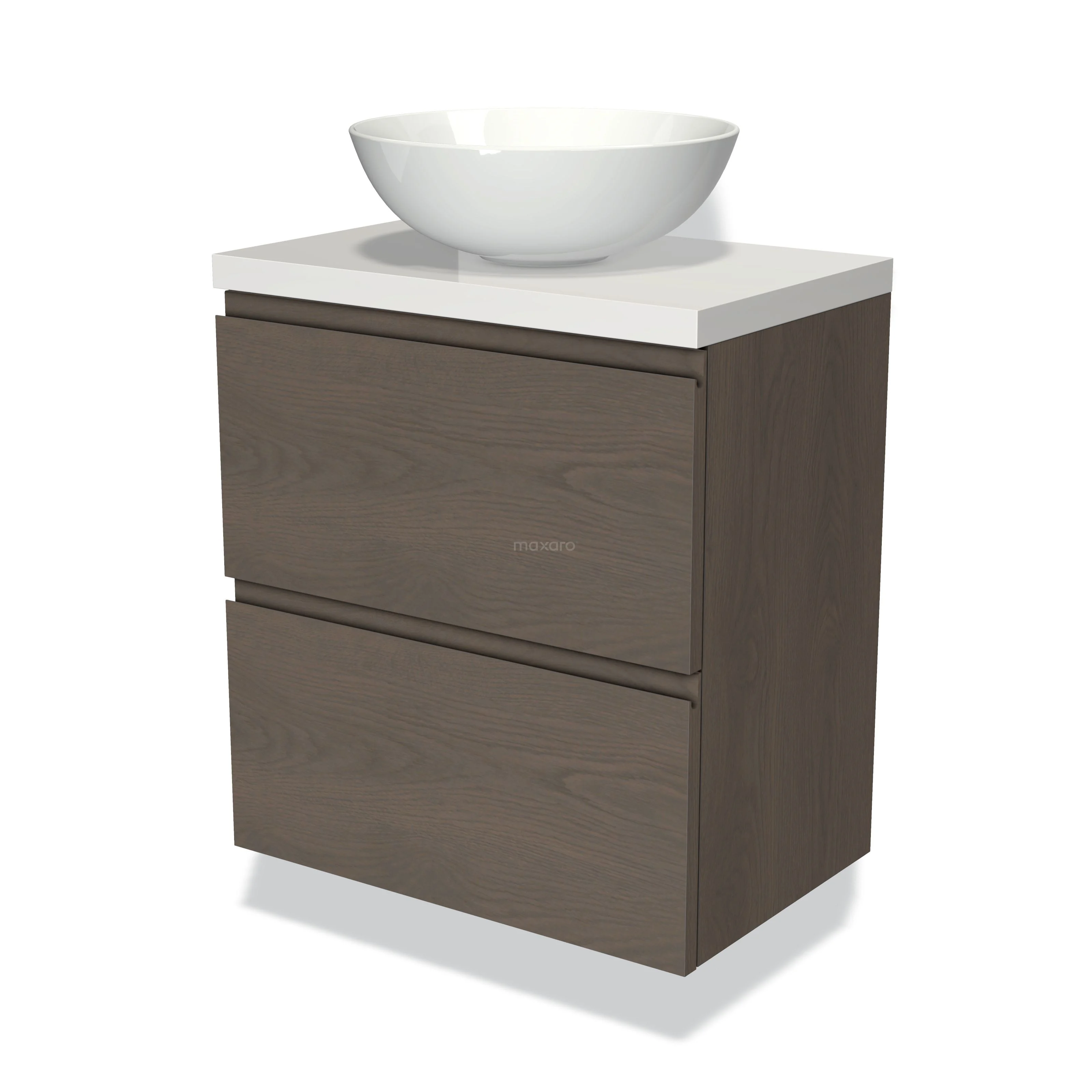 Modulo Plato Slim Badmöbel mit Aufsatzwaschbecken | 60 cm Dunkelbraune Eiche Grifflos front Hochglanz Weiß blatt 2 übereinanderliegende Schubladen