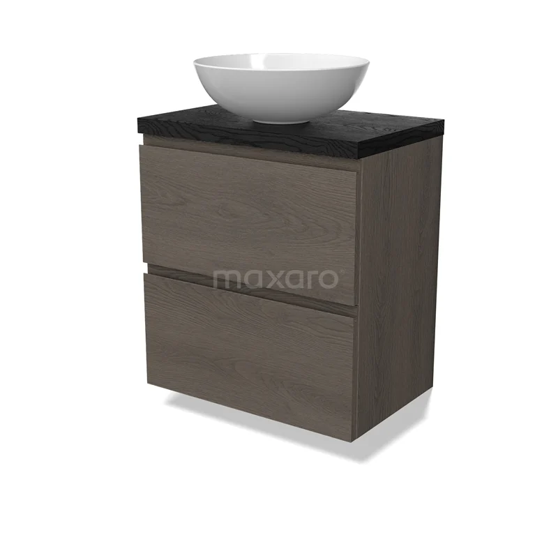 Modulo Plato Slim Badmöbel mit Aufsatzwaschbecken | 60 cm Dunkelbraune Eiche Grifflos front Schwarze Eiche blatt 2 übereinanderliegende Schubladen
