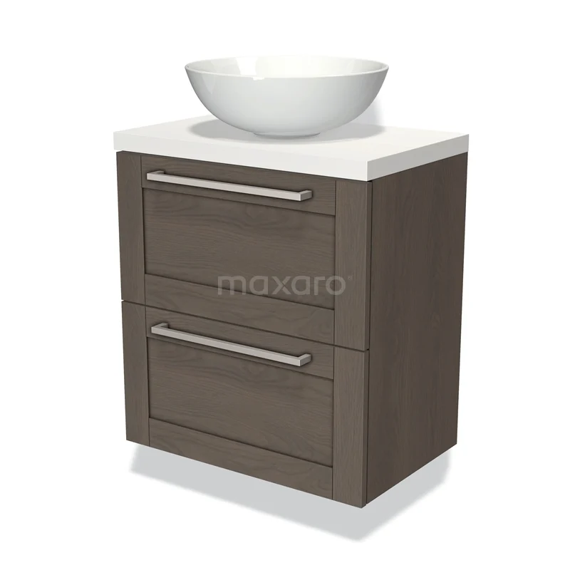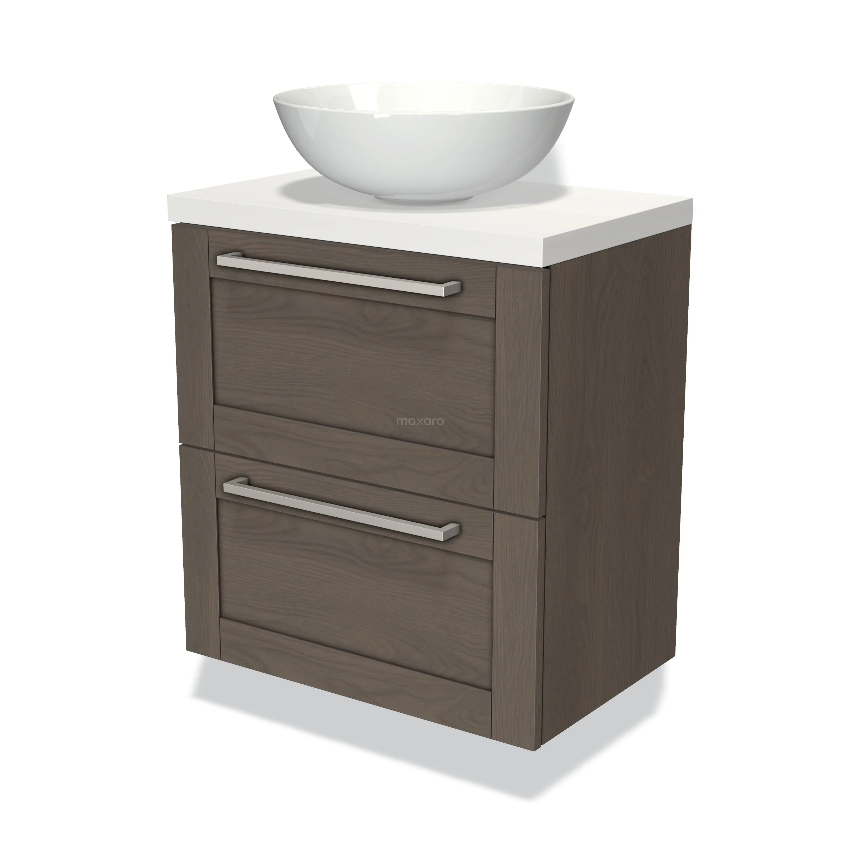Modulo Plato Slim Badmöbel mit Aufsatzwaschbecken | 60 cm Dunkelbraune Eiche Rahmen front Matt Weiß blatt 2 übereinanderliegende Schubladen