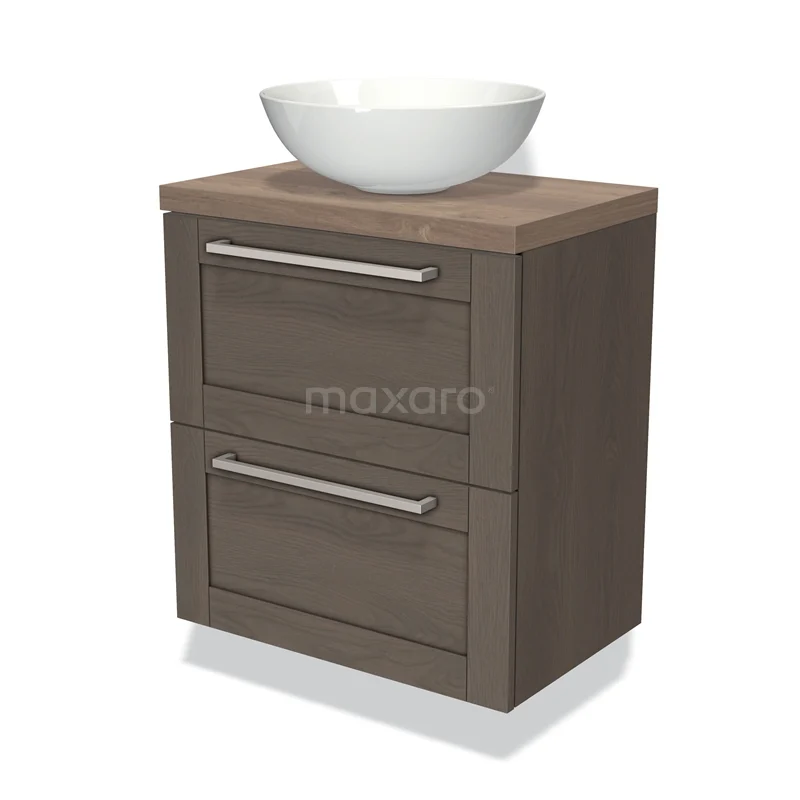 Modulo Plato Slim Badmöbel mit Aufsatzwaschbecken | 60 cm Dunkelbraune Eiche Rahmen front Mittelbraune Eiche blatt 2 übereinanderliegende Schubladen