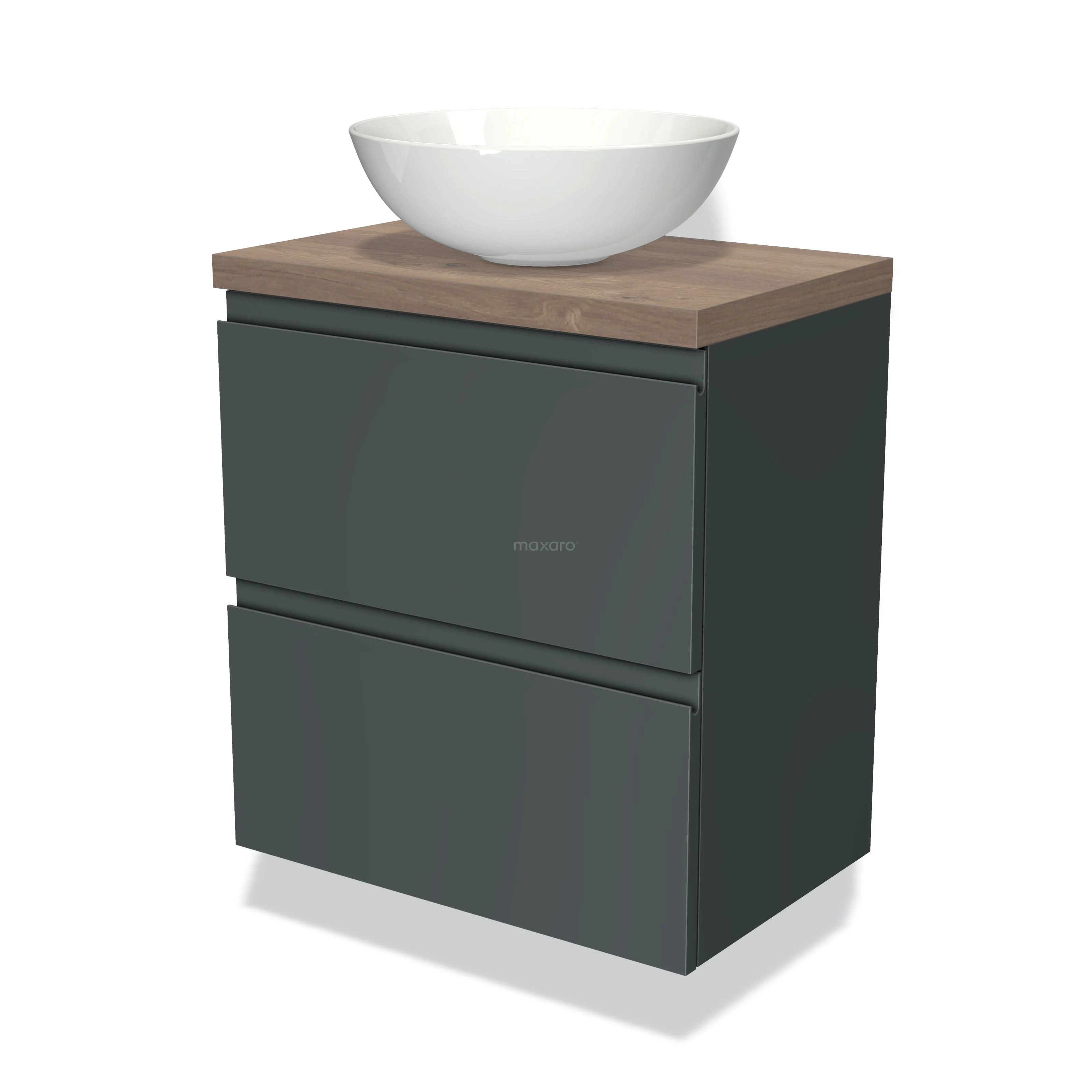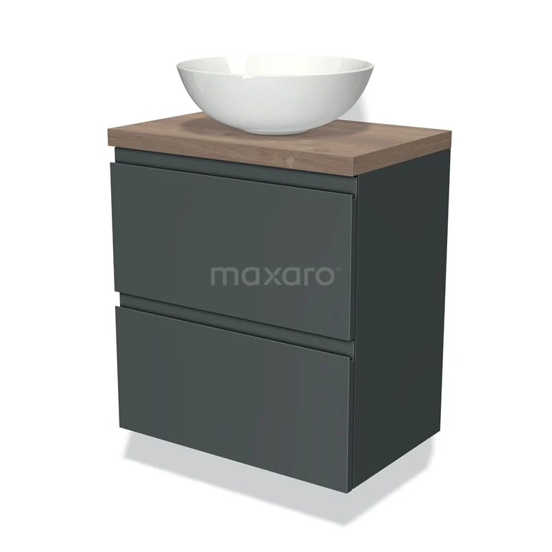 Modulo Plato Slim Badmöbel mit Aufsatzwaschbecken | 60 cm Dunkelgrau Grifflos front Mittelbraune Eiche blatt 2 übereinanderliegende Schubladen